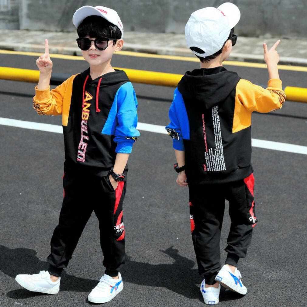 新作 2021年子供用春秋男の子服フード付きコートパッチワークジャケット+パンツベビーボーイズ2点セット