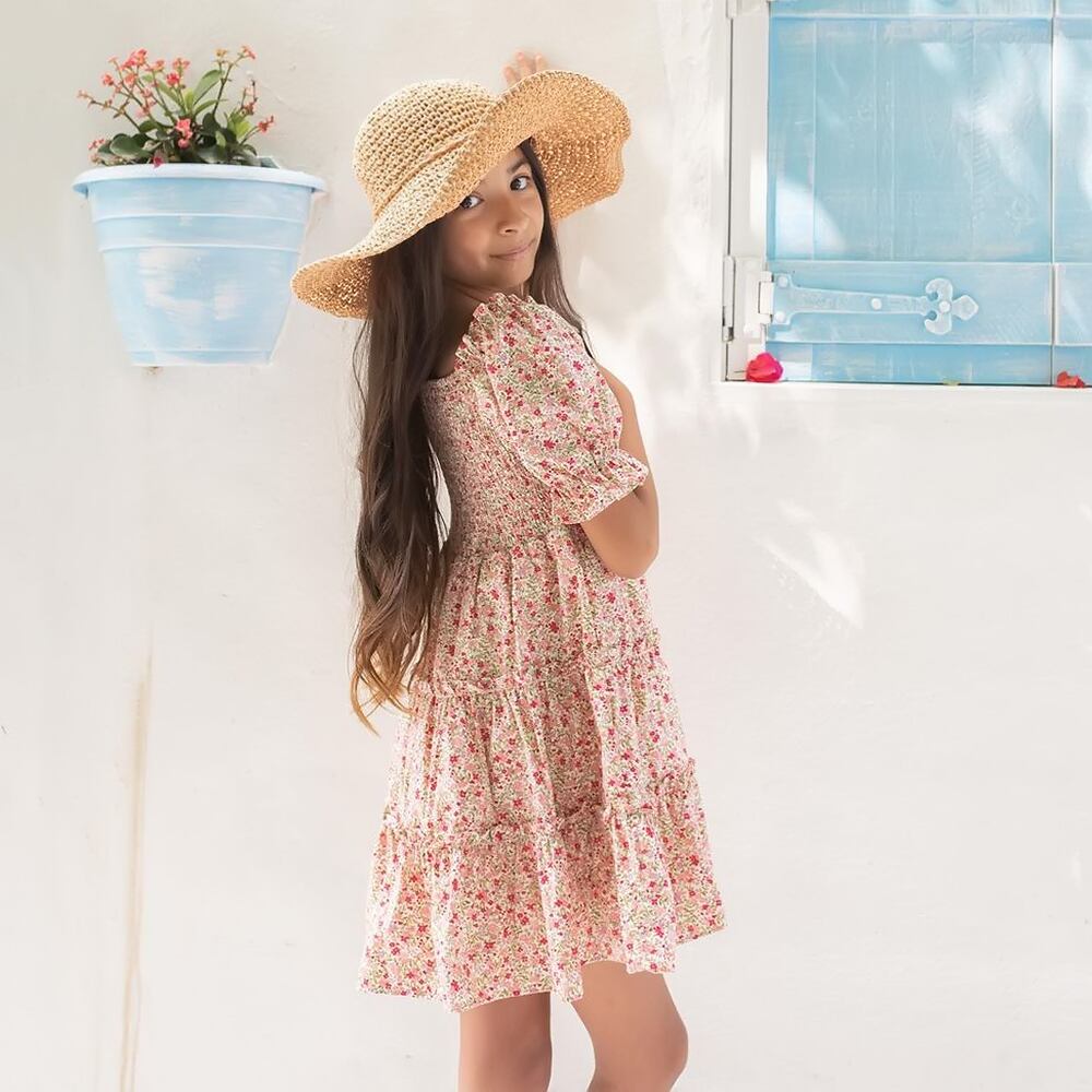 新作 3~8歳用 春夏の女の子用半袖ドレス 子供 フラワープリントスモックデイリー服 キッズ パーティーフリルベスリドガール ショート ハーフスリーブ サマー 夏物 フラワーデザイン