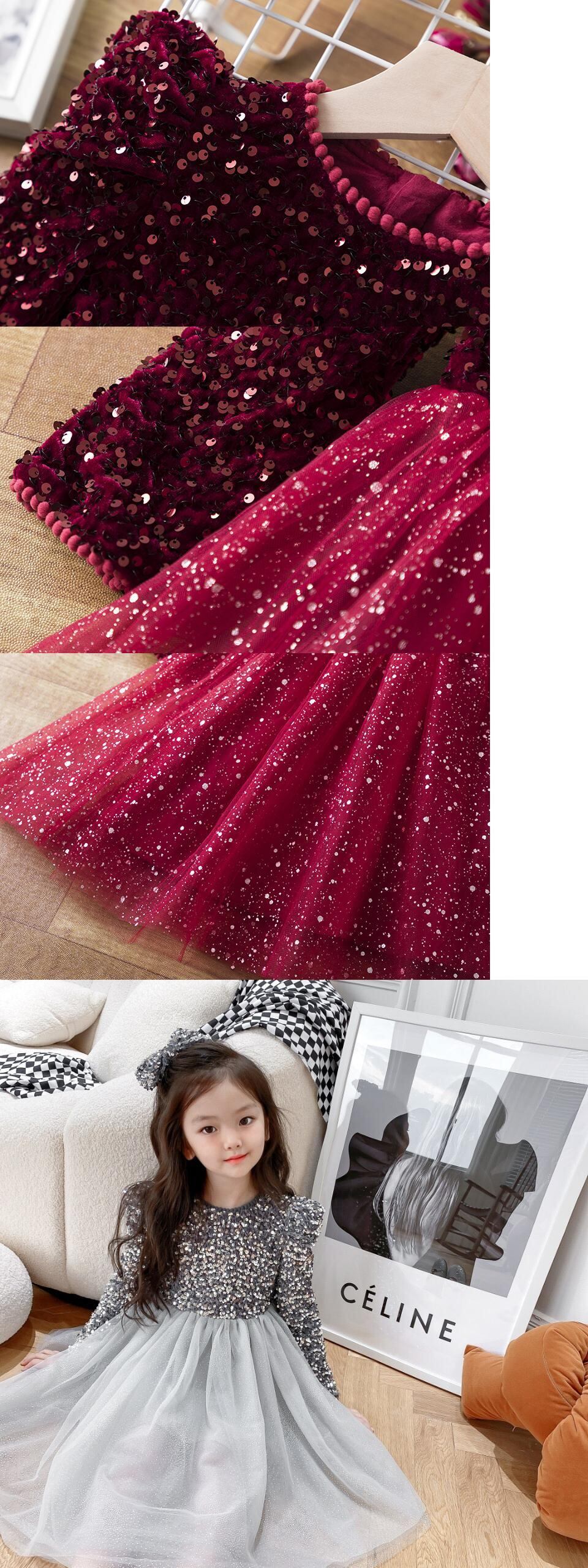 新作 春/秋長袖スパンコールシャイニードレス女の子子供年チュール布2個子供誕生日パーティーVestido ロング スプリング 春物 オータム 秋物