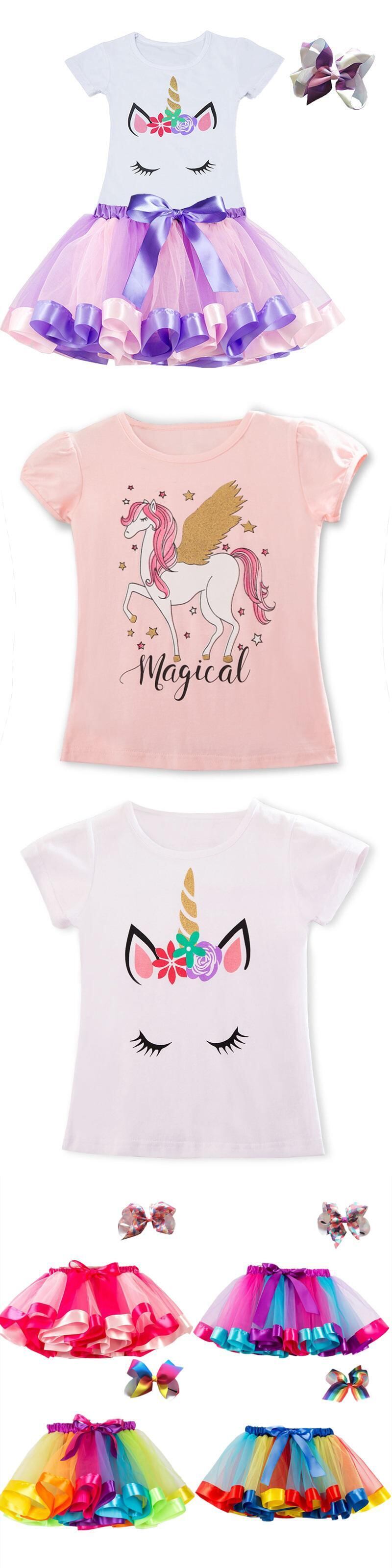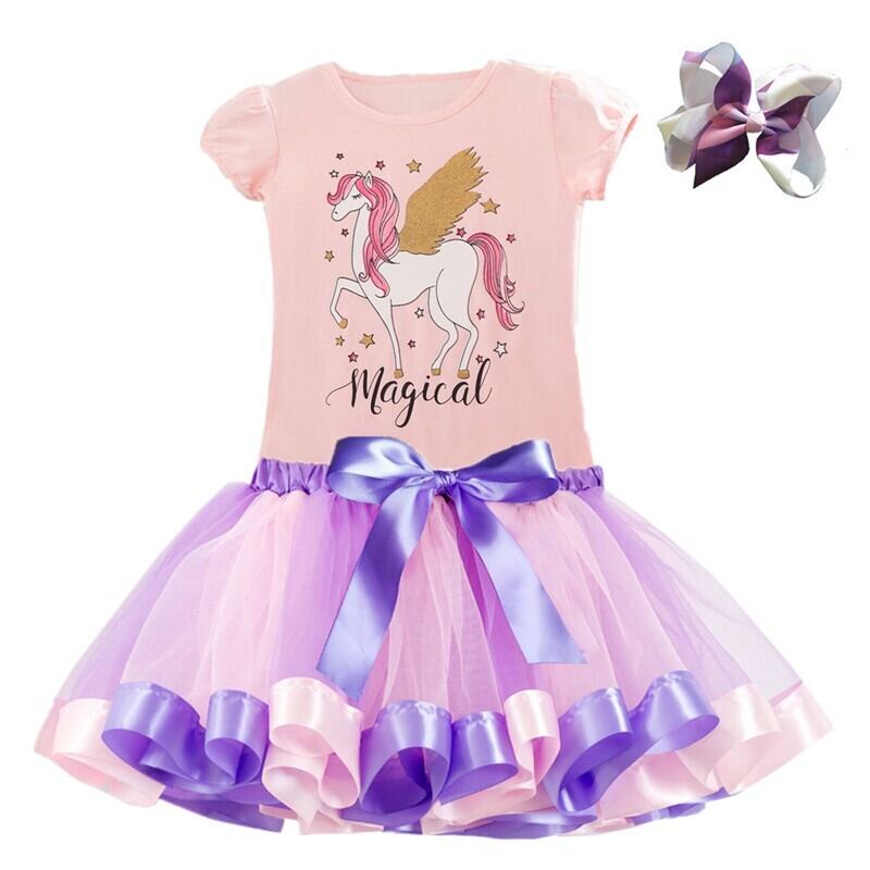 新作 3~8歳女の子セットキッズ ユニコーン Uincornトップス+カラフルなチュチュドレス キッズ春 夏服 子供 Vestido サマー 夏物 パニエ ペチコート
