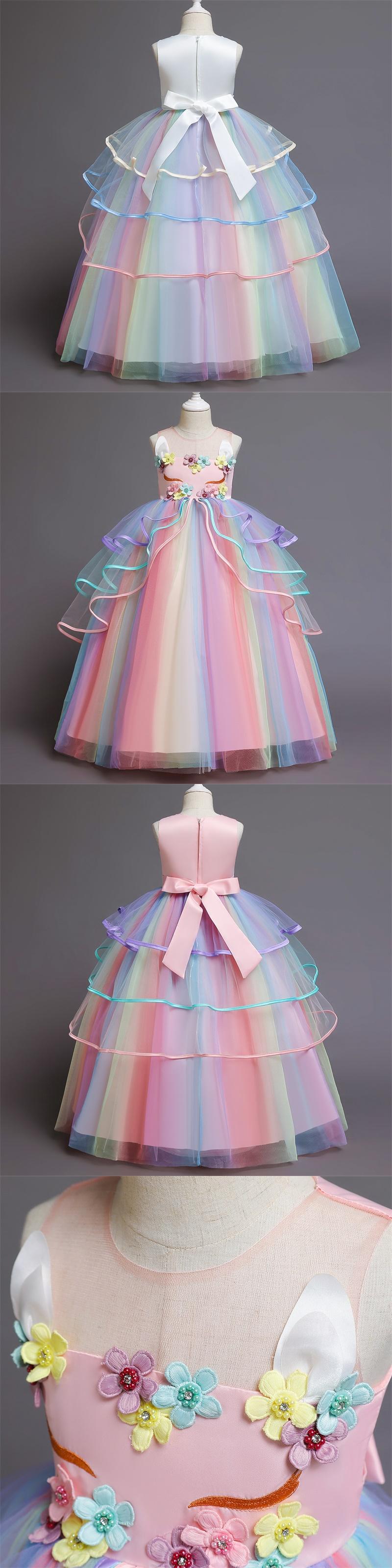 新作 女の子レインボーユニコーンコスプレドレス子供カーニバル服結婚式の誕生日パーティーイブニングマルガウン