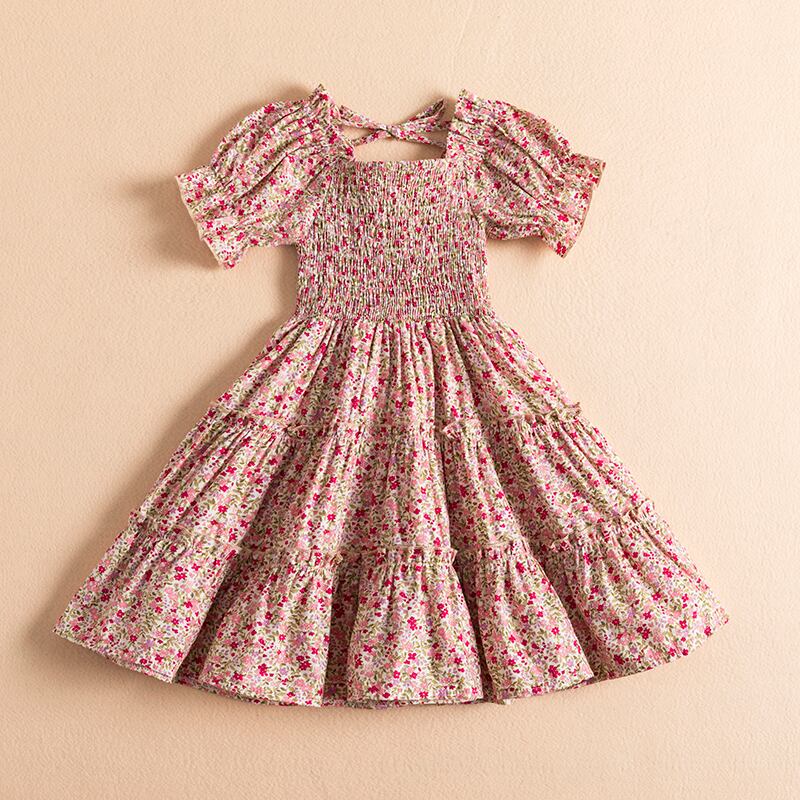 新作 夏の女の子ノースリーブストラップドレス子供フラワープリント布キッズパーティースモックドレス女の子 サマー 夏物 フラワーデザイン