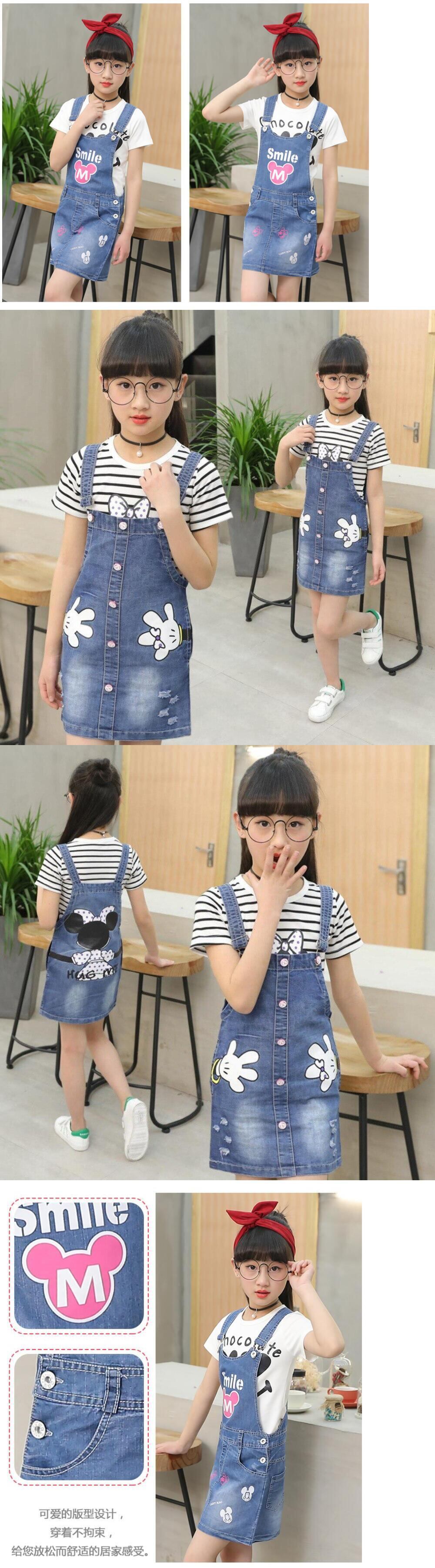 新作 4〜12歳の女の子のサスペンダースカート半袖シャツ2個セットデニムストラップスカート女の子オーバーオール十代の子供たち ショート ハーフスリーブ