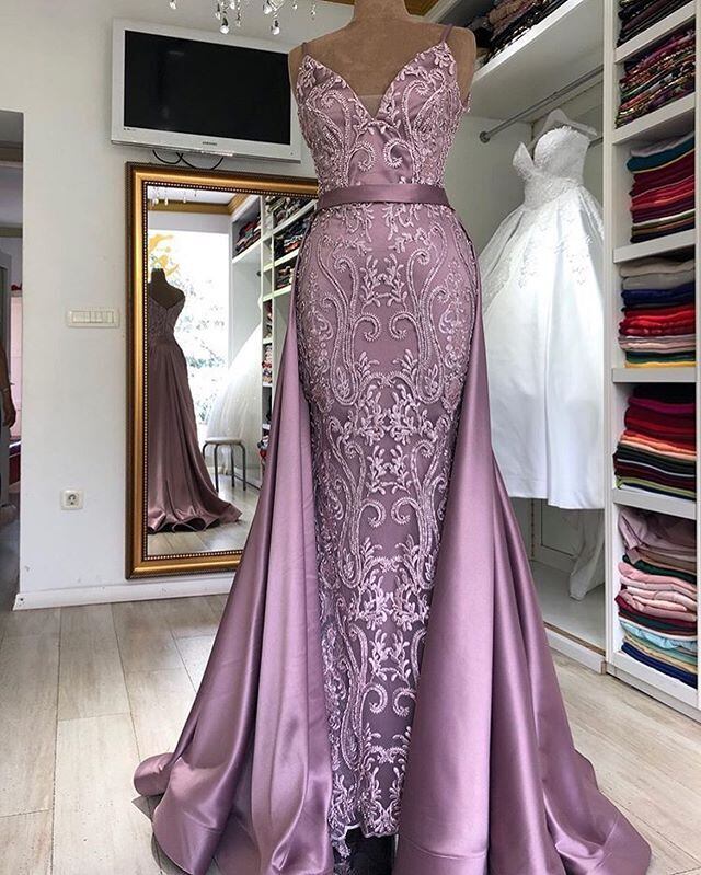 取り外し可能なトレイン付きアラビアドバイレースマーメイドイブニングドレス2019Vネックバックレスサテンロングイブニングパーティードレス女性