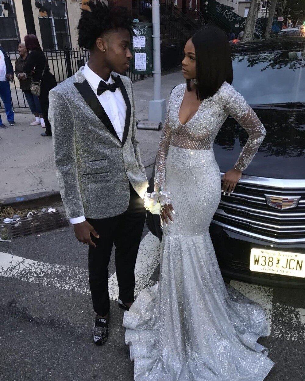 キラキラシルバースパンコールマーメイドウエディングドレス2019セクシーなアフリカのVネック黒の女の子長袖卒業パーティードレスガラドレス