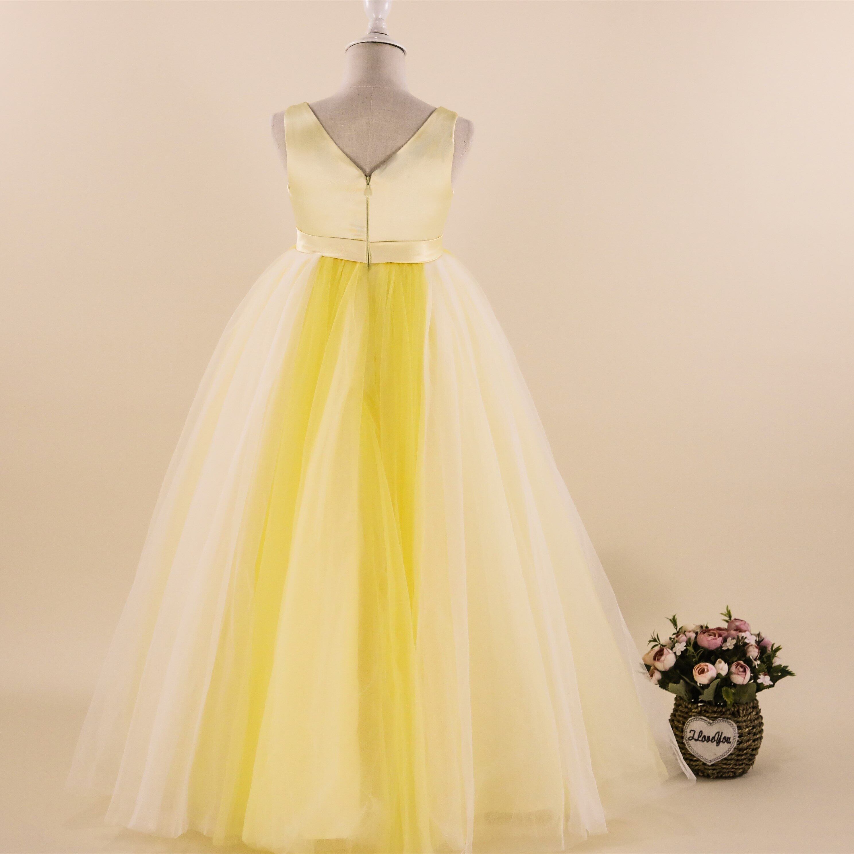 新作 Vネックフラワーガールドレスウェディング初聖体イエローチュールパーティーウエディングページェントガウンキッズベルト付き