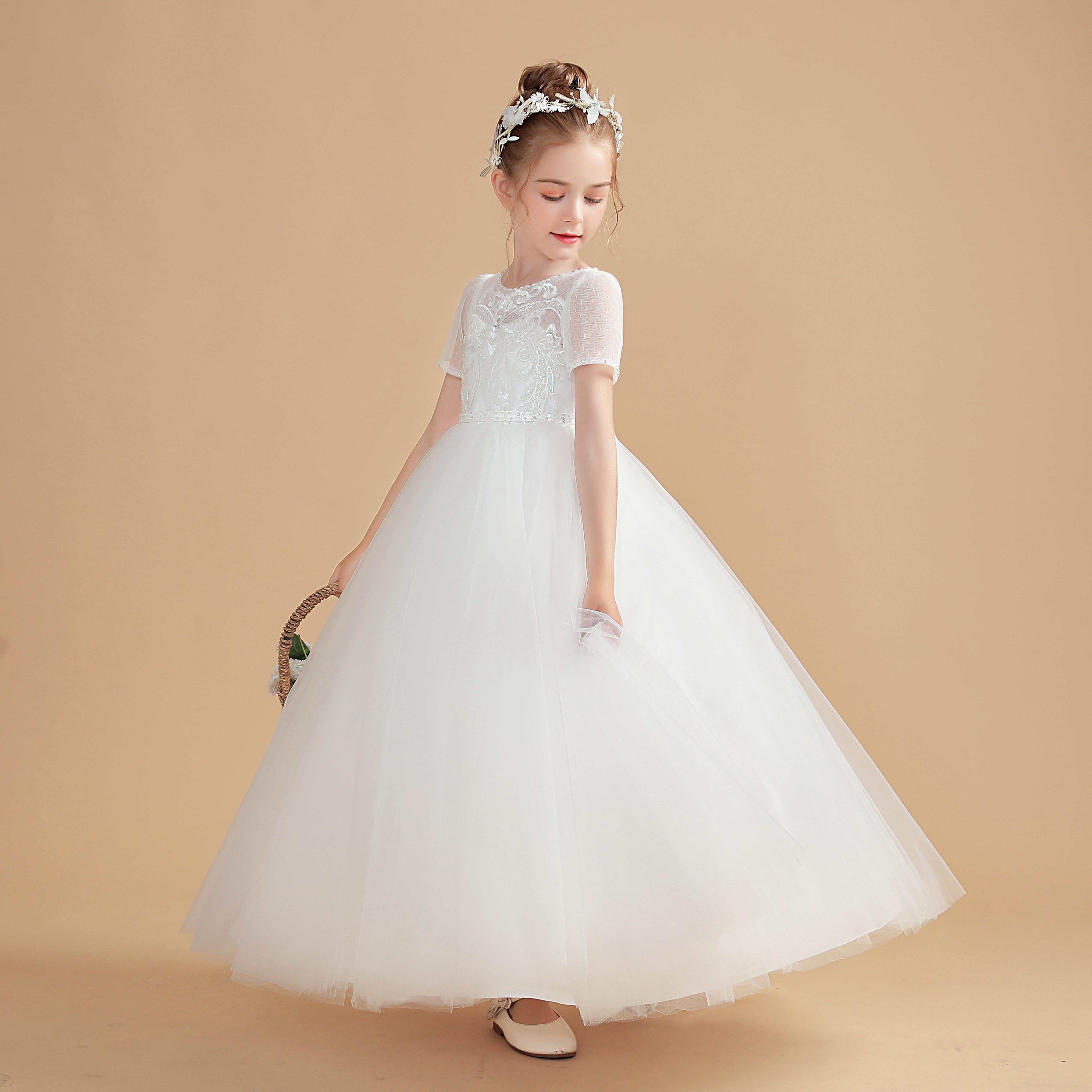 新作 ガールドレスフリルボールガウンフラワーガールドレスアイボリーアップリケキッズウェディングページェントガウンVestidos