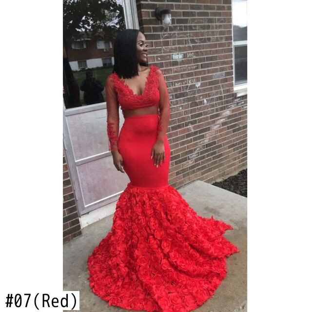 アフリカンブラックガールズレッドマーメイドウエディングドレス2019セクシーシアーウエストアップリケ長袖3Dフラワートレイン女性パーティードレス