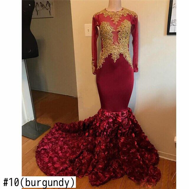 アフリカンブラックガールズブルゴーニュマーメイドウエディングドレス2019セクシーな薄手の長袖ゴールドレースの女性のパーティードレス、3Dフラワートレイン