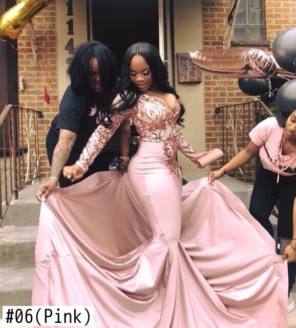 セクシーなスパンコールトップピンク長袖マーメイドウエディングドレス2019Vネックサテンコートトレイン女性ウエディングパーティードレス黒の女の子