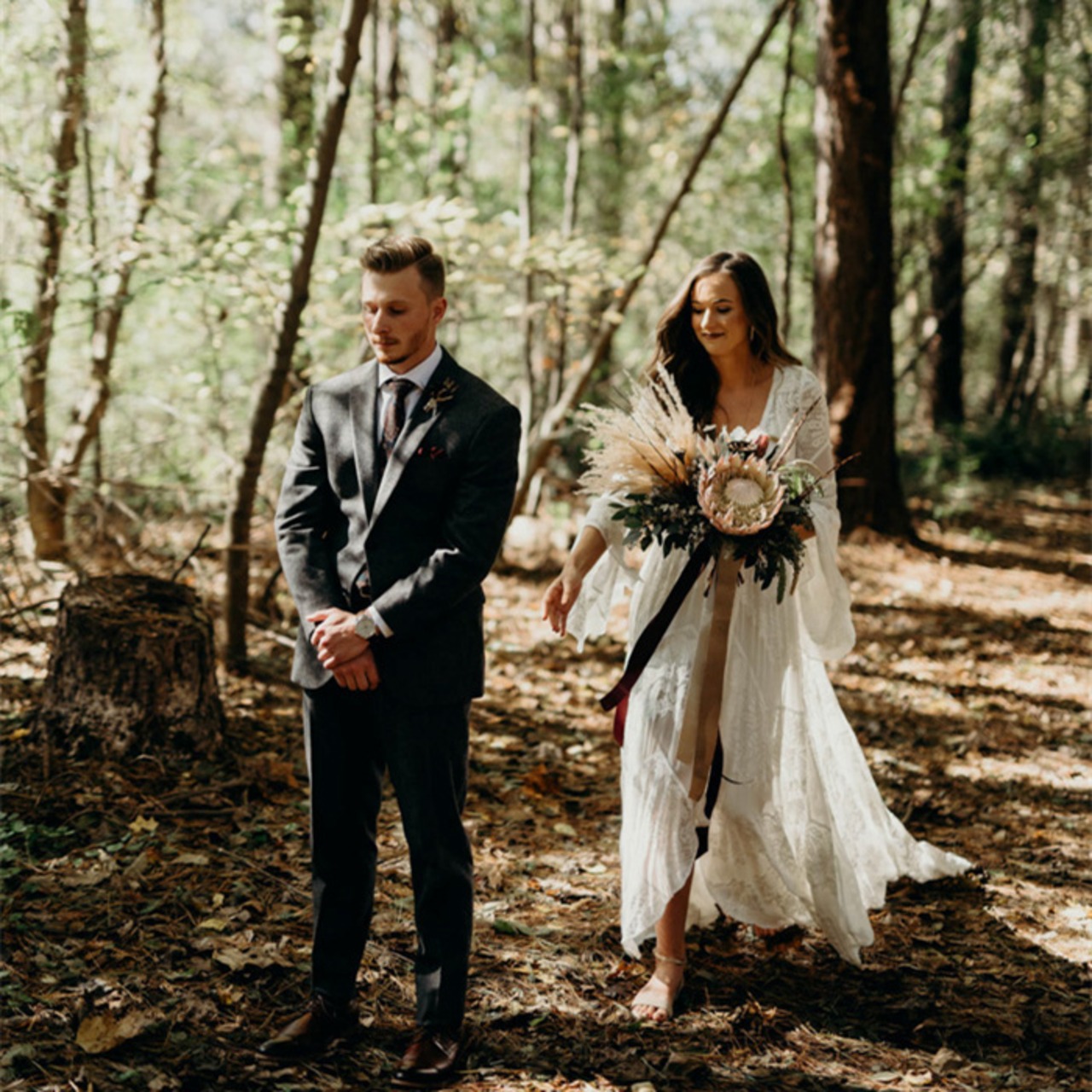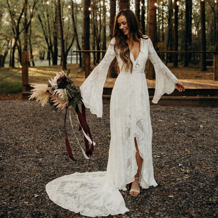 ディープVネックフレアスリーブスプリットロングトレインカントリーサイドウェディングドレスRobeDeMarieeのFATAPAESEレースウェディングドレス