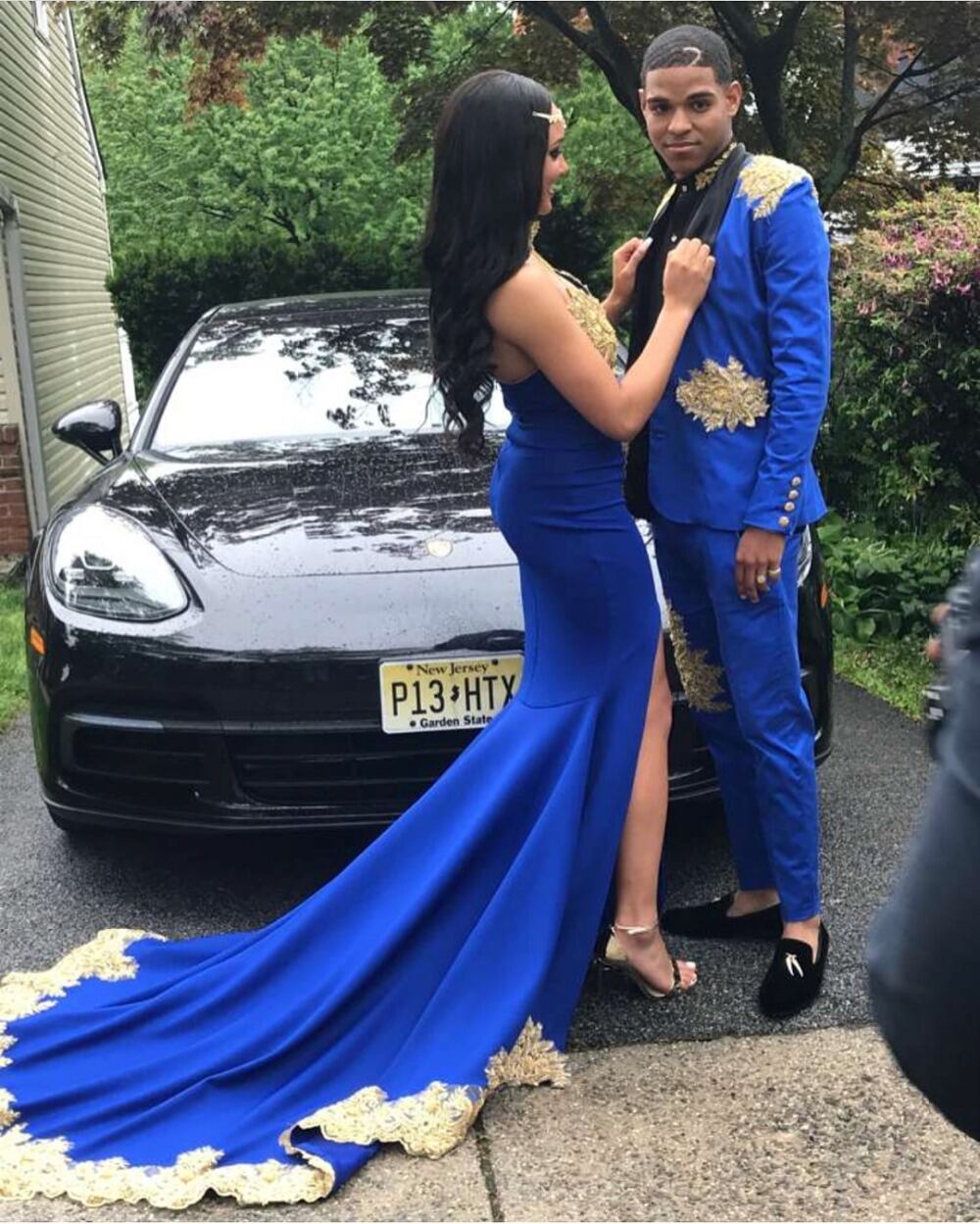 セクシーなアフリカンブラックガールズロイヤルブルーマーメイドウエディングドレス2019ネックゴールドレースアップリケ女性ロングイブニングパーティードレス