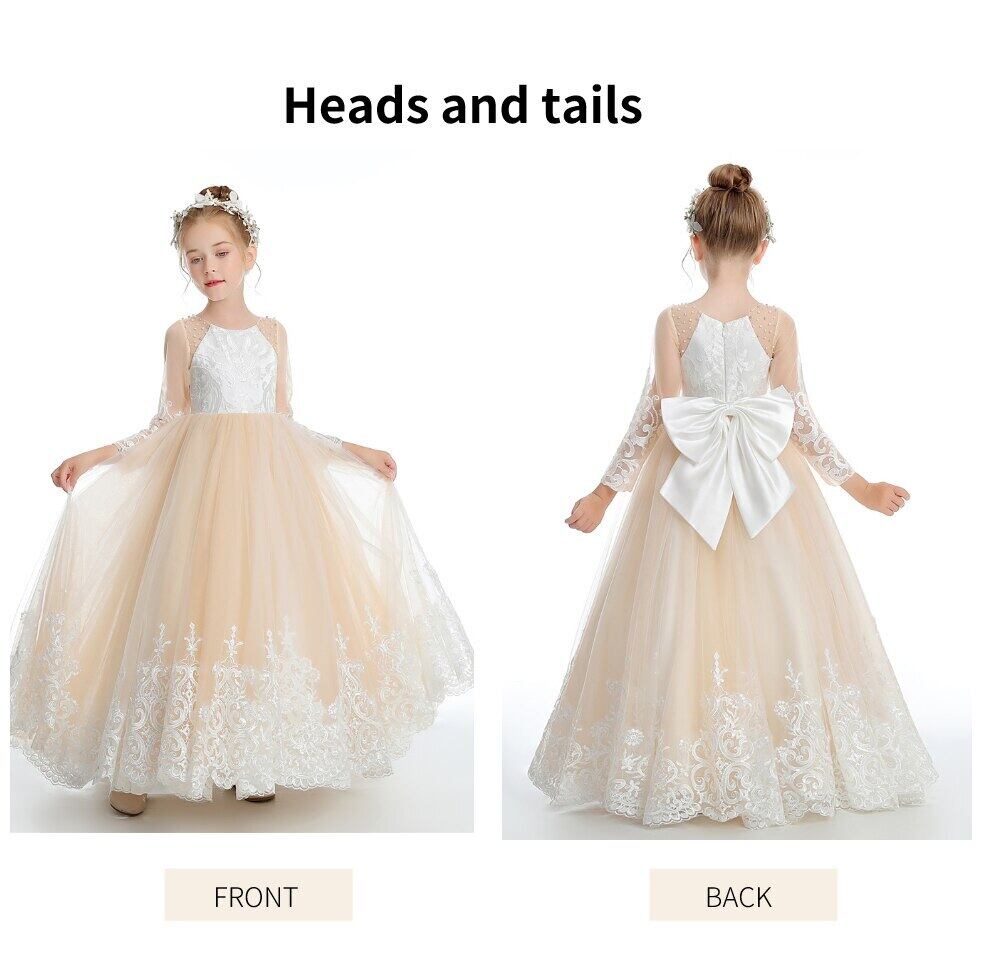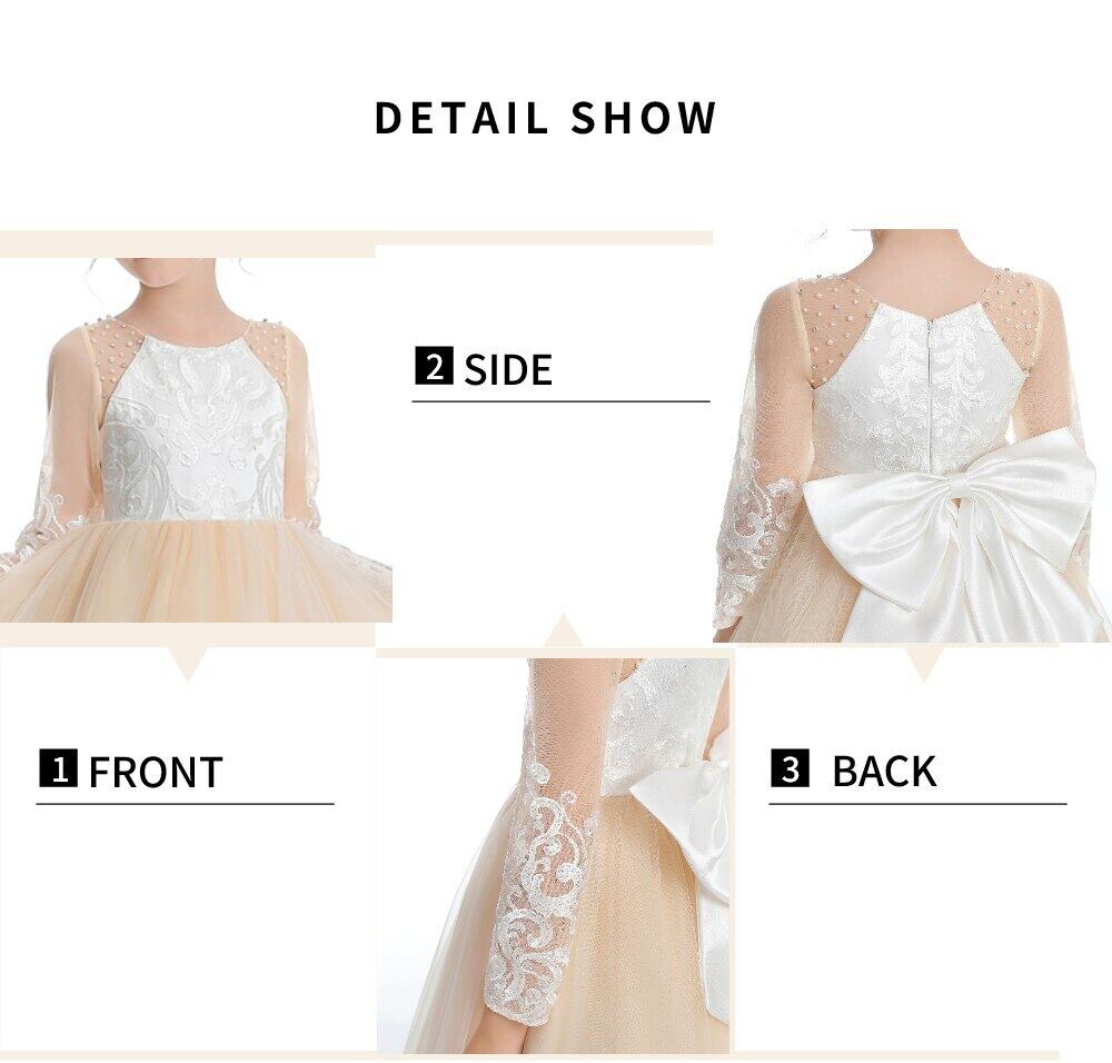 新作 ふくらんでいるチュールレースボールガウンフラワーガールドレス長袖キッズドレスイリュージョンウェディングパーティードレス初聖体弓