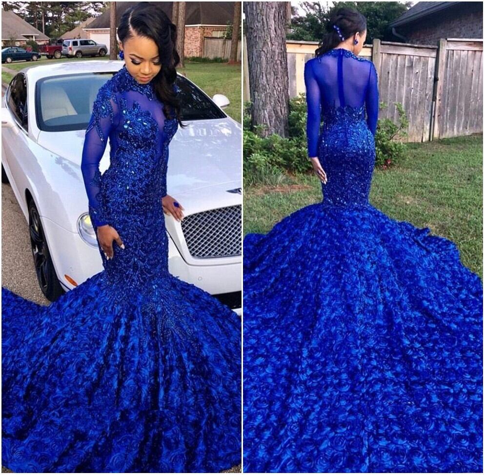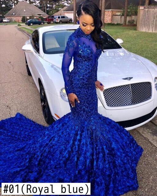 リアル写真ロイヤルブルーマーメイドウエディングドレス2020ネック長袖アップリケ冬のマルドレスイブニングパーティードレス女性