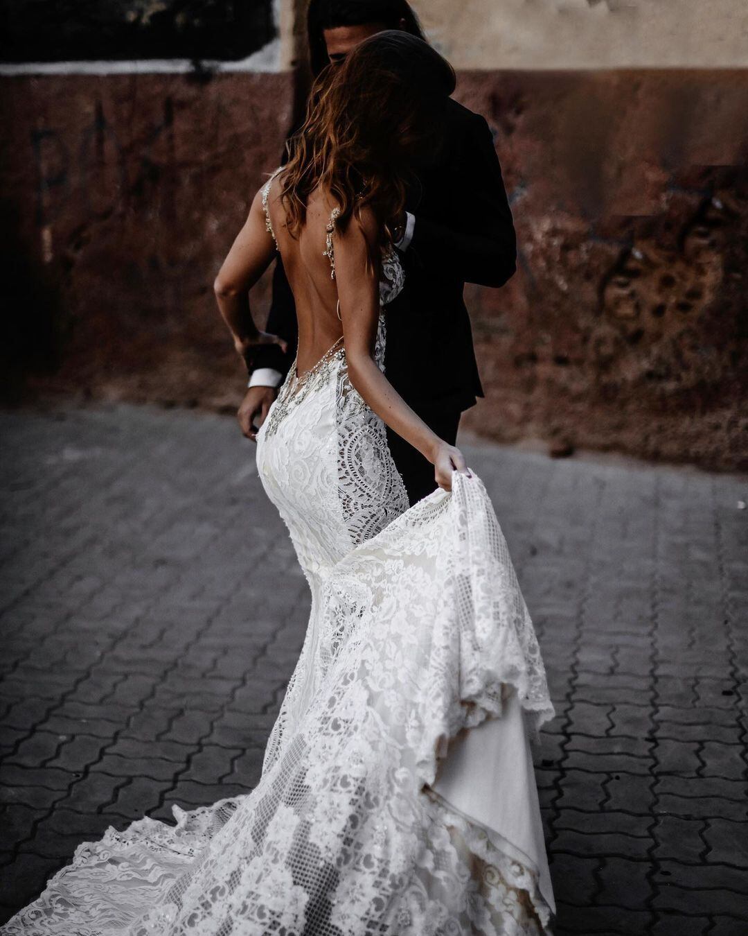 FATAPAESEVネックウェディングドレスマーメイドホローバックレスジッパーアップリケフラワービーズビーチチュールガウンブライダルアクセサリー