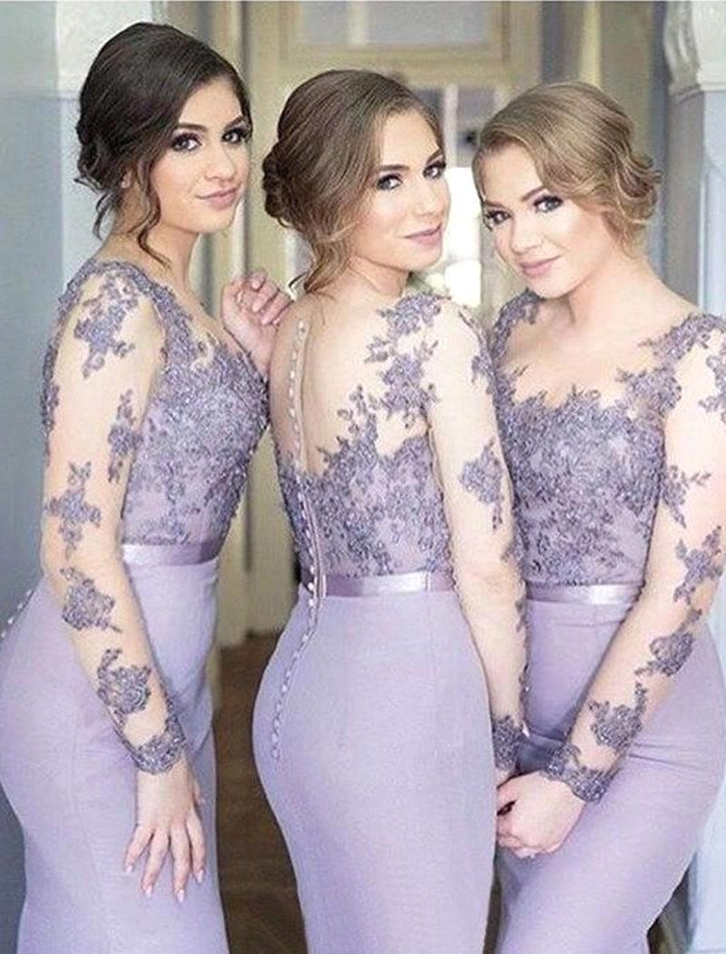 ライトパープル長袖レースブライドメイドドレス2019キャンディーカラーボタンバックマーメイドドレスウェディングパーティーVestidosDeFiesta