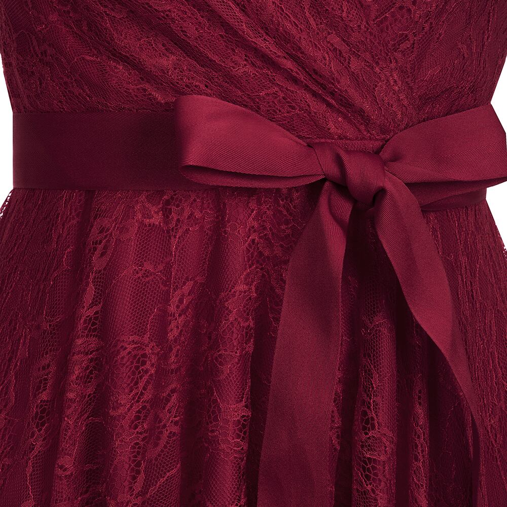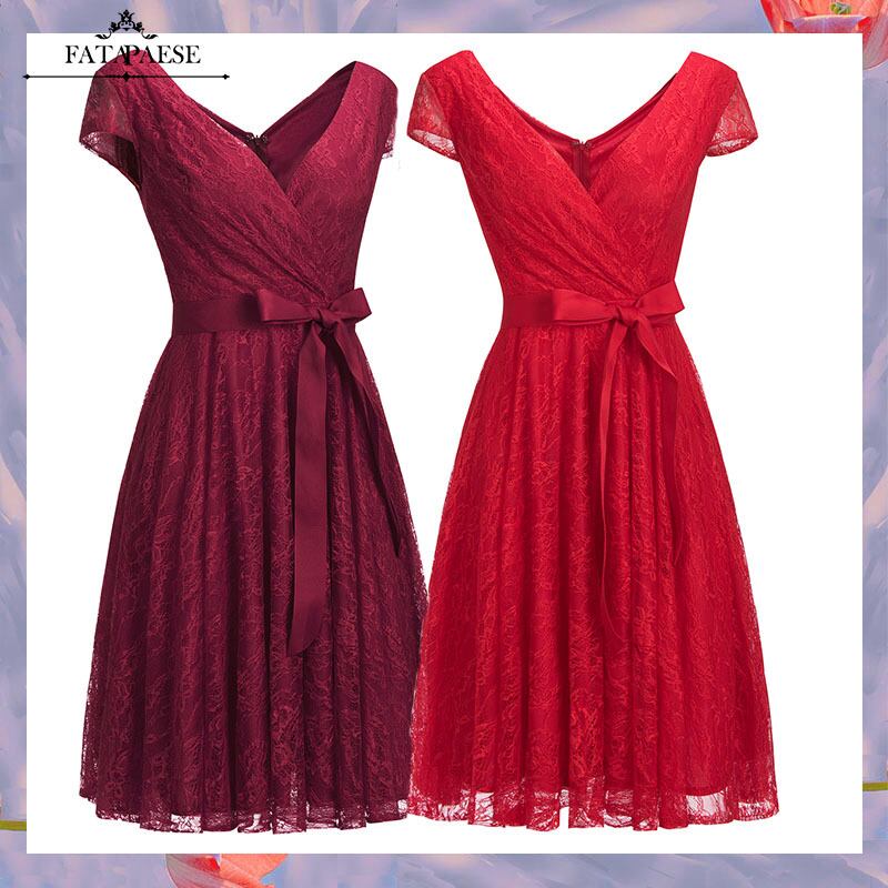 FATAPAESEVネックAラインブルゴーニュショートレースイブニングドレスカクテルパーティーマルドレスイブニングドレスウエディングドレスVestidosGala