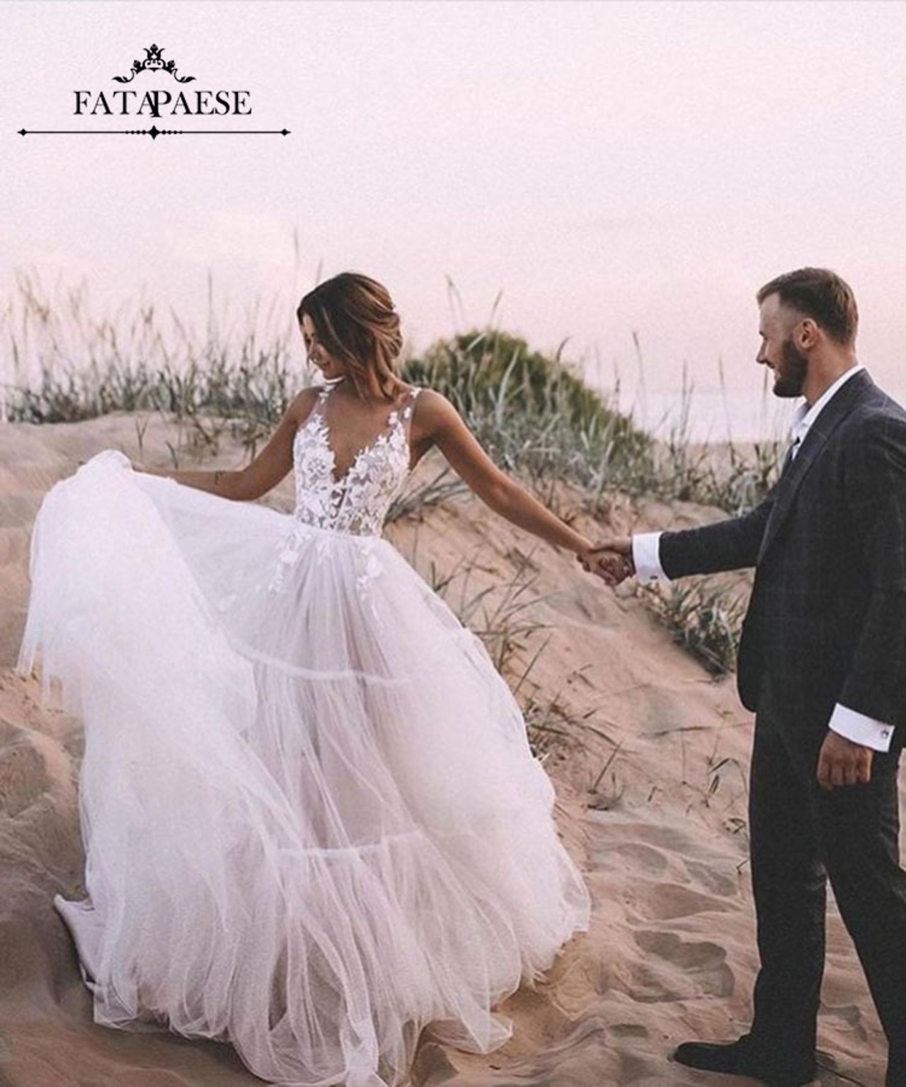 FATAPAESEウェディングドレス花嫁アップリケフラワーVネックホローチュールブライダルガウンビーチローブマリアージュヴェスティドデノイバ