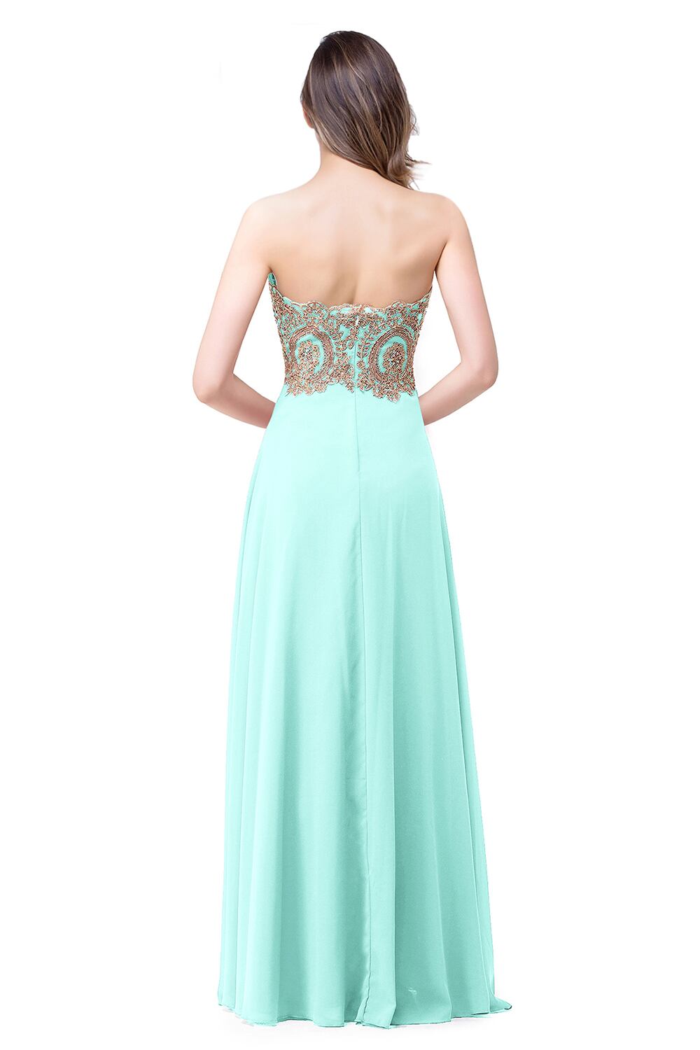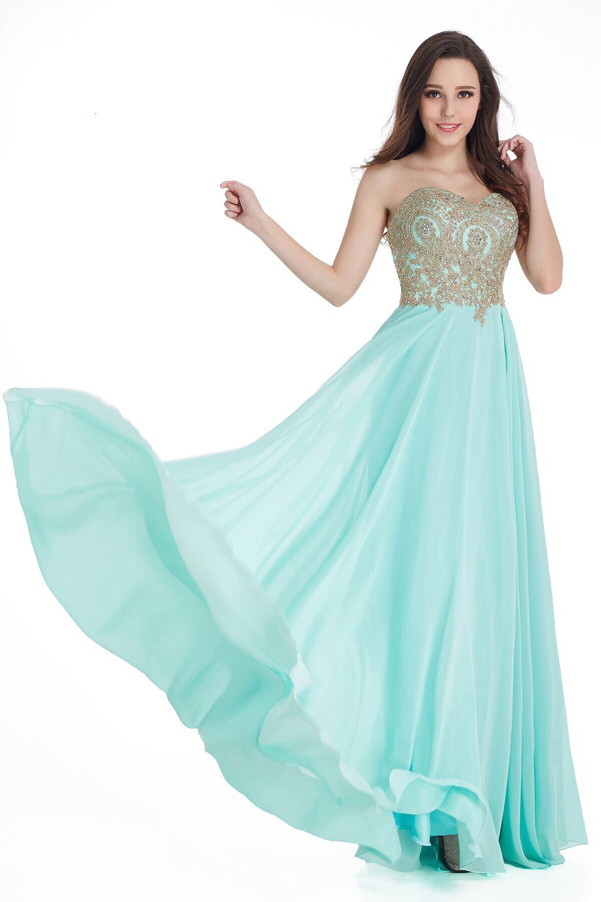 FATAPAESEミントグリーンシフォンロングイブニングドレスストラップレスノースリーブマルパーティードレスゴールドアップリケローブドソワレ