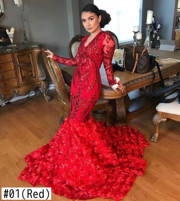 FATAPAESEキラキラ光る長袖スパンコール赤いウエディングドレスセクシーなアフリカのVネック長いマーメイドウエディング卒業パーティーガウン女の子Gitter
