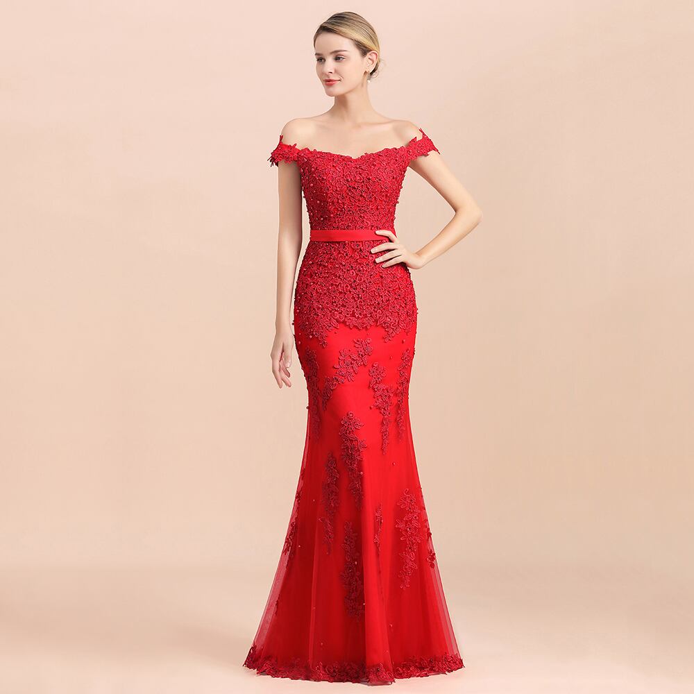 FATAPAESE赤い背中の開いたイブニングドレスオフショルダービーディングマーメイドイブニングドレスレースマルドレスパーティーローブデソワレ