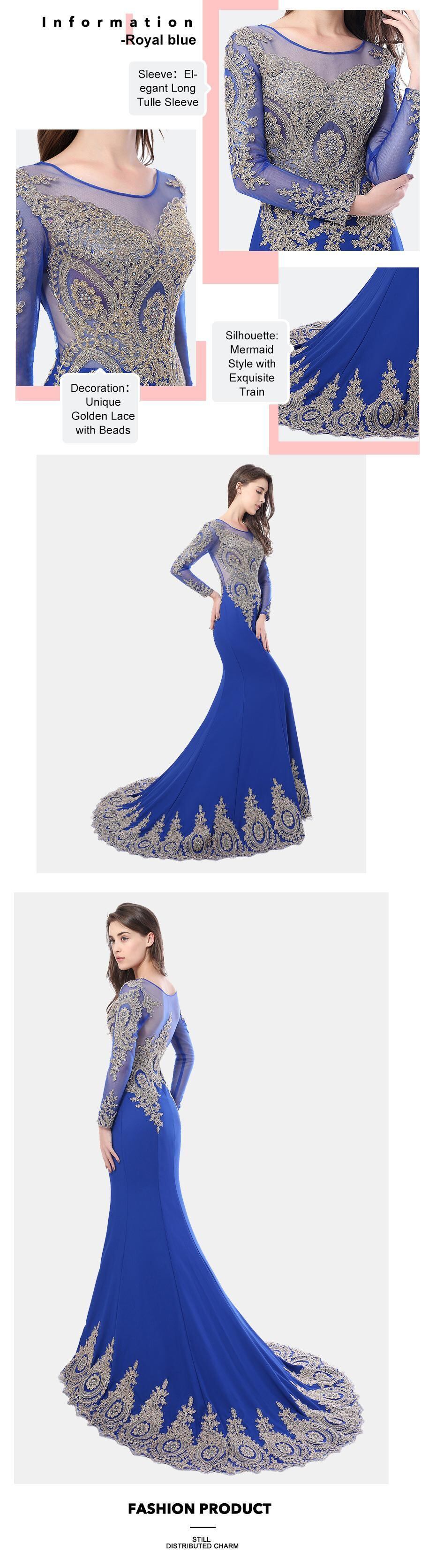 FATAPAESEマーメイドウエディングドレスゴールドアップリケフルスリーブロイヤルブルーウェディングイブニングドレス高級ビーズメッシュバックVestidos