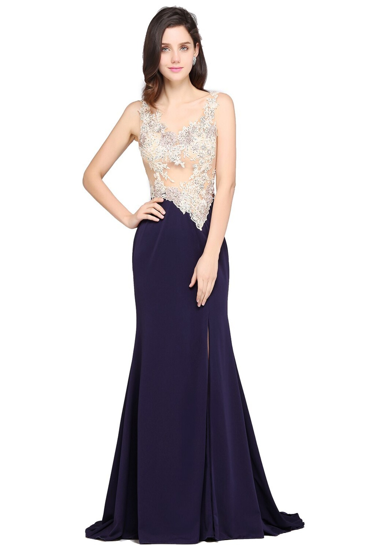 FATAPAESEVestidosセクシーイリュージョンレースマーメイドイブニングドレスクリスタルVネックサイドスリットマルドレスローブデソワレ
