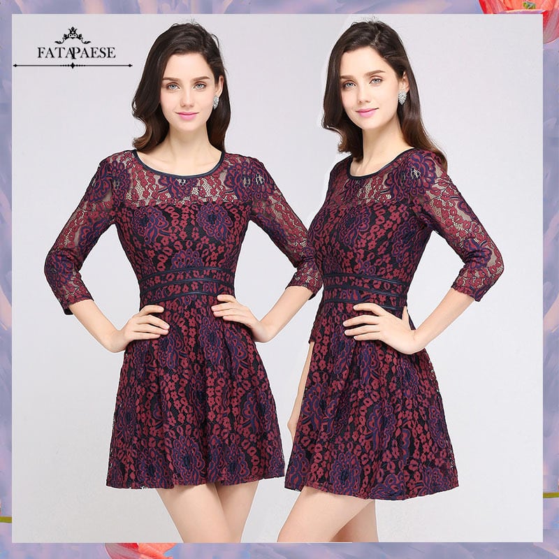 FATAPAESEミニドレスレースカクテルドレス3/4スリーブサマーガールガウンパーティーAラインカクテルパーティーミニドレスローブデカクテル