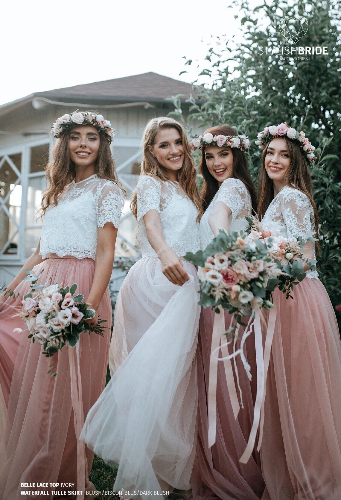 FATAPAESEブラッシュピンクの花嫁介添人ドレスボヘミア自由奔放に生きる夏のレーストップとベルレースの下のチュールスカートは女性のガウンを適用します