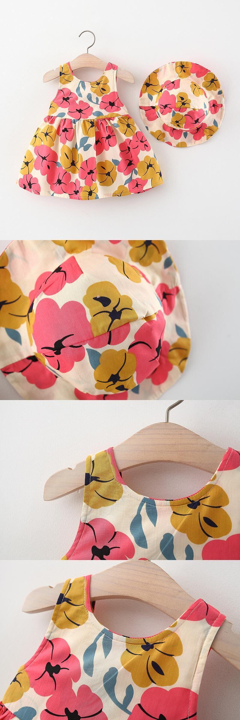 新作 2ピースキッズサマーセットかわいい花生まれの女の赤ちゃんドレスノースリーブビーチ衣装幼児ドレス+サンハット