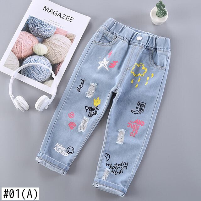 新作 キッズガールジーンズ花柄漫画ロングパンツ春秋グラフィティ絵画プリントズボン穴 JYF