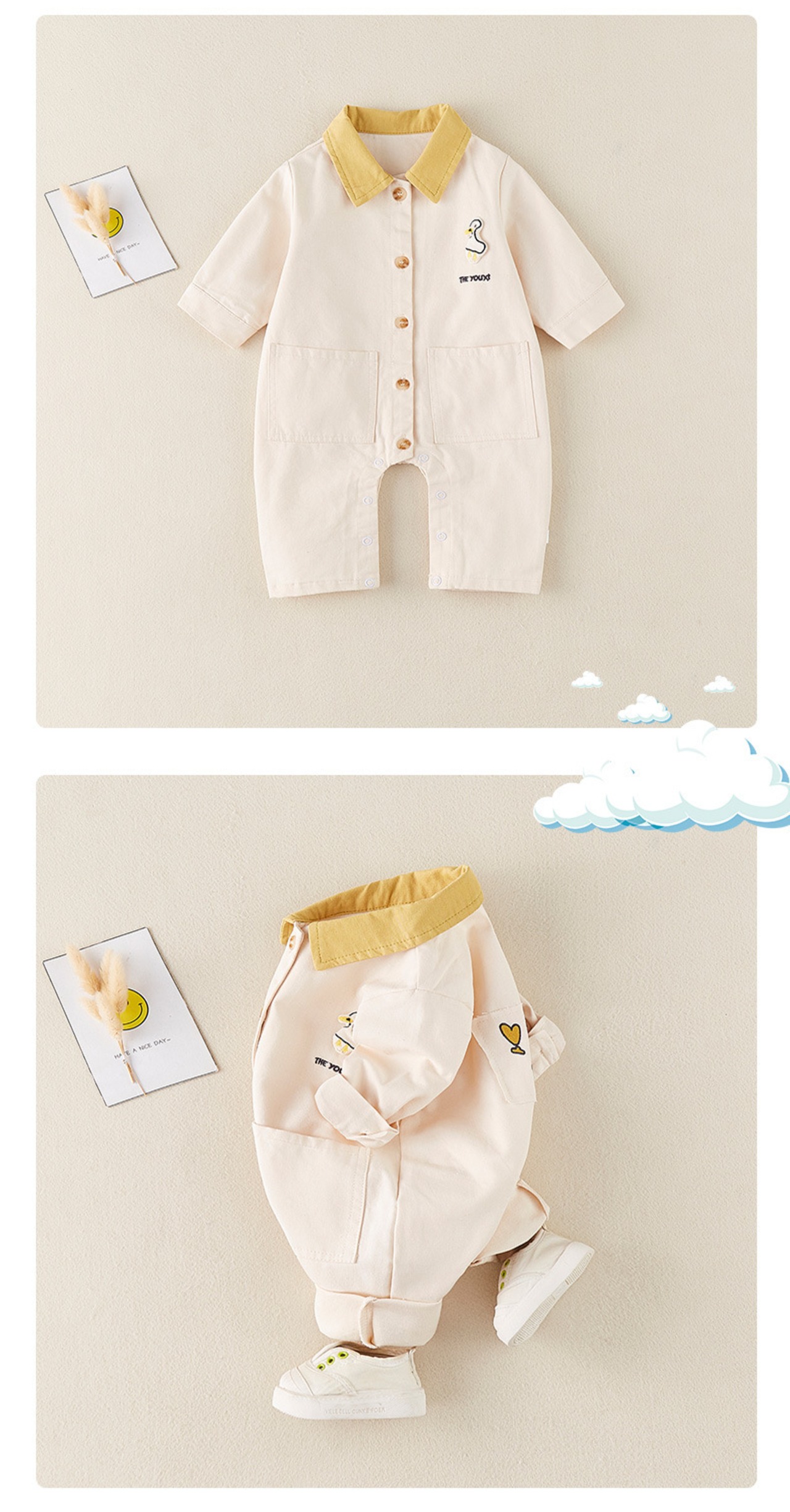 新作 秋冬ベビーボーイズガールズクール漫画アヒルカーゴジャンプスーツターンダウン襟長袖新生児キッズコットン衣装服