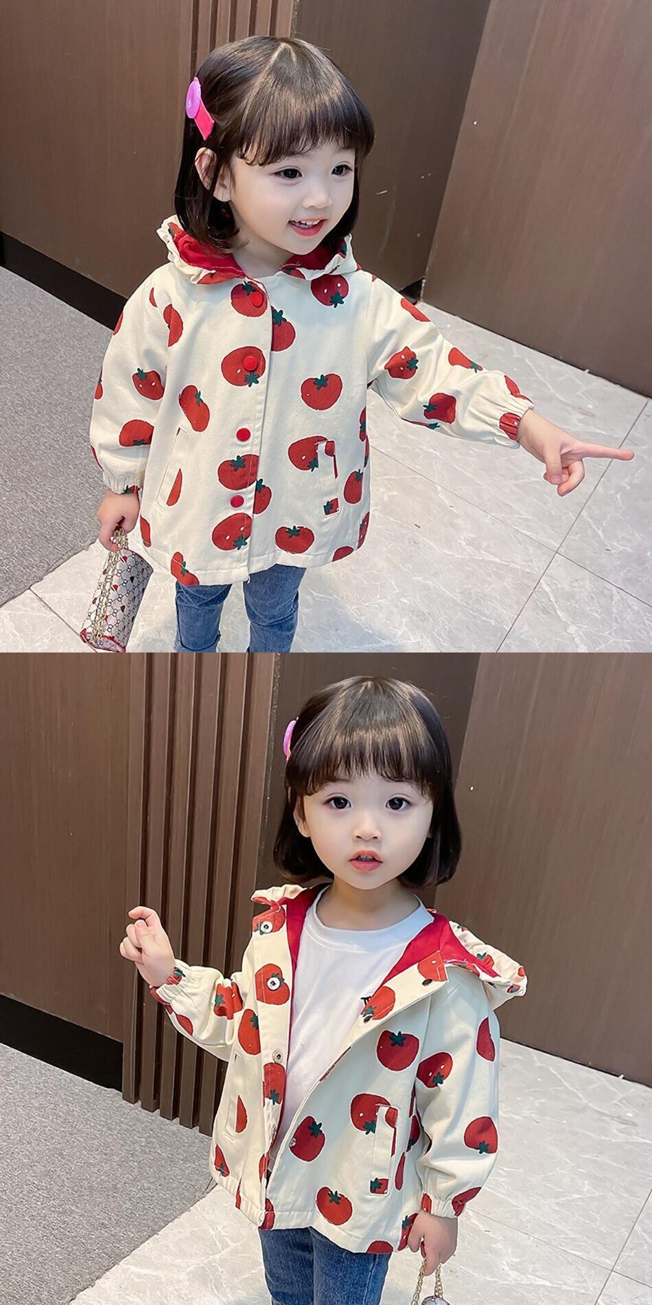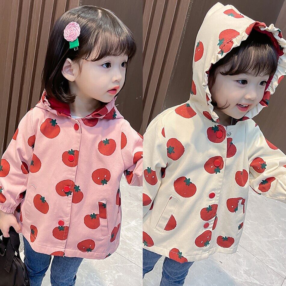 新作 春ウインドブレーカー女の赤ちゃんストロベリードットフード付きトレンチコート子供キッズジャケットガールズアウター JYF