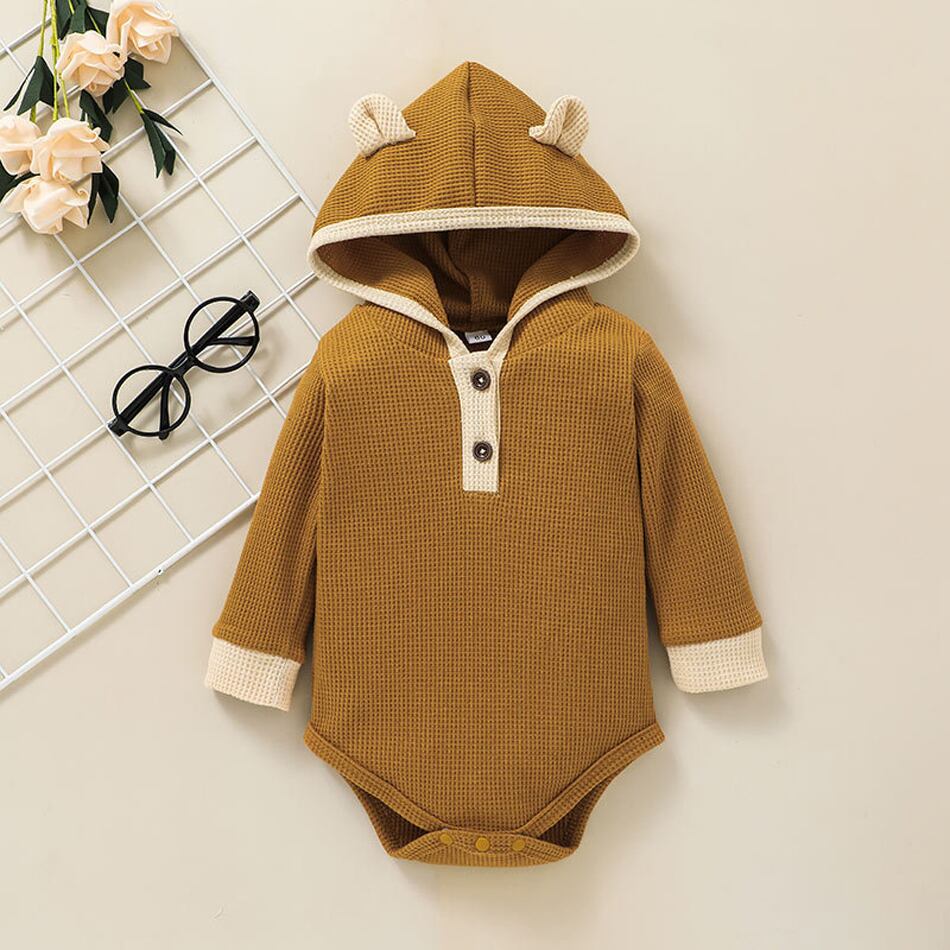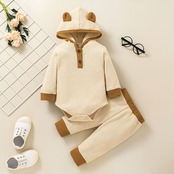 新作 新生児 2 個リブ衣装セット長袖無地耳パーカーとパンツセットキッズボーイズ春秋