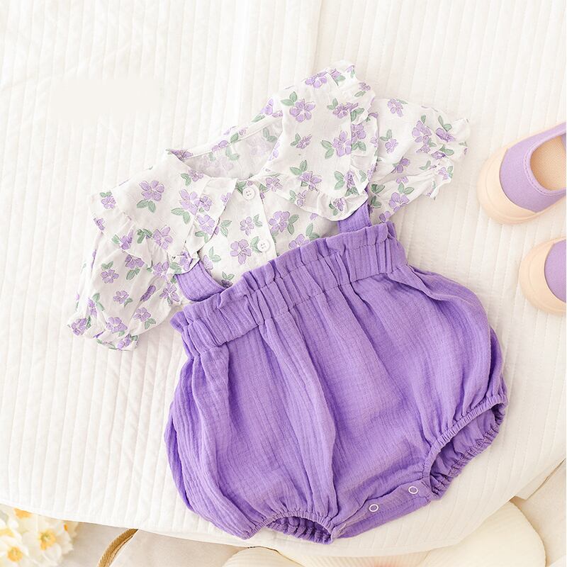 新作 夏のベビー服新生児ボディスーツ子供服幼児パープルフラワーレースガールドレスジャンプスーツ新生児ロンパース 3 6 9 12 メートル