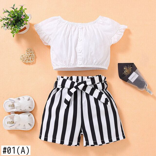 新作 夏のキッズベビー服幼児の女の子の衣装半袖ボタンクロップトップス + ストライプショーツセット 2-6Y
