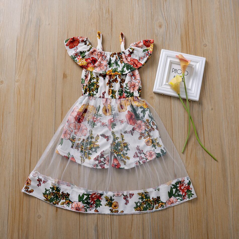新作 幼児キッズベビーガールロンパースドレスフリルオフショルダーレース花柄パーティーチュチュメッシュドレス