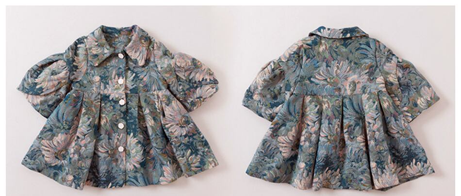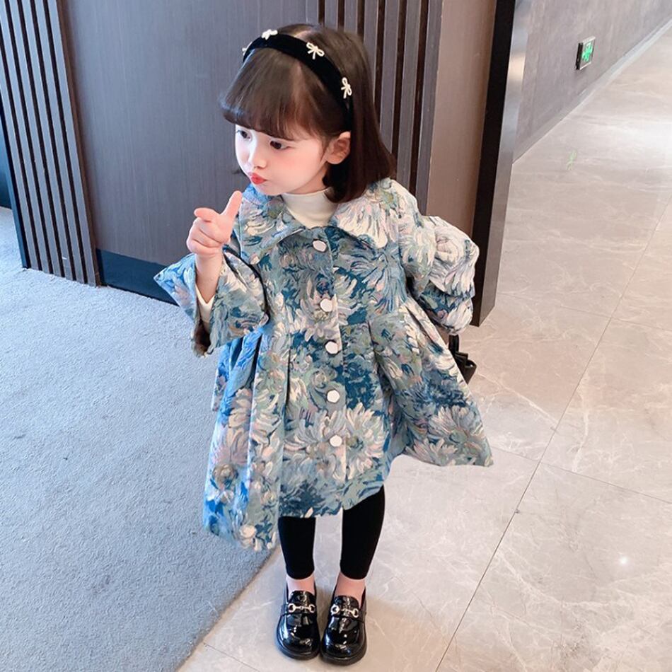 新作 女の子ウインドブレーカーロング 2021 秋冬コート秋のドレススタイル子供キッズオーバーコート油絵ひまわりトップ