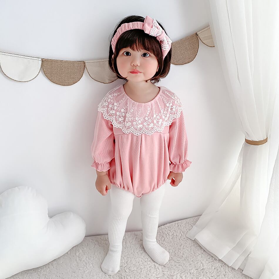 新作 春秋幼児女の赤ちゃんレースフリルロンパース + ヘッドバンドキッズガール長袖ジャンプスーツ服 0-24M