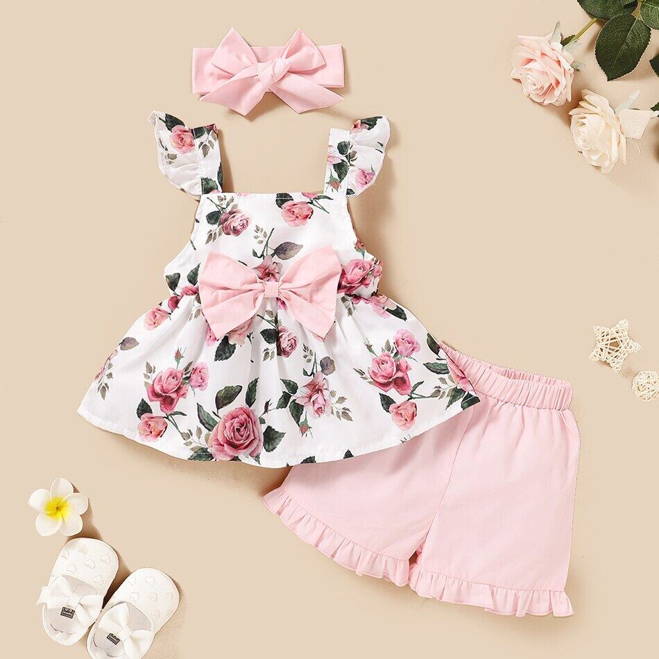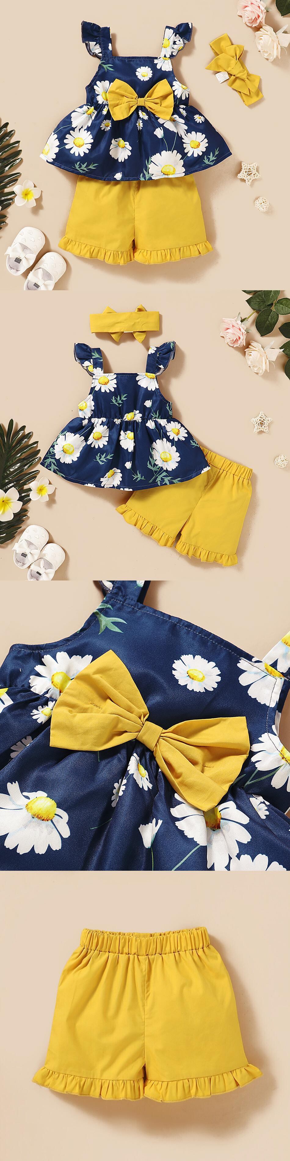 新作 新生児女の子花びらスリーブスリング花背中の開いた花ちょう結びサンスーツソリッドショーツヘッドバンド 3 個ベビー服