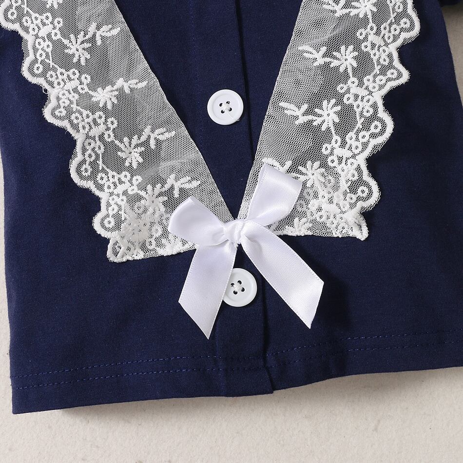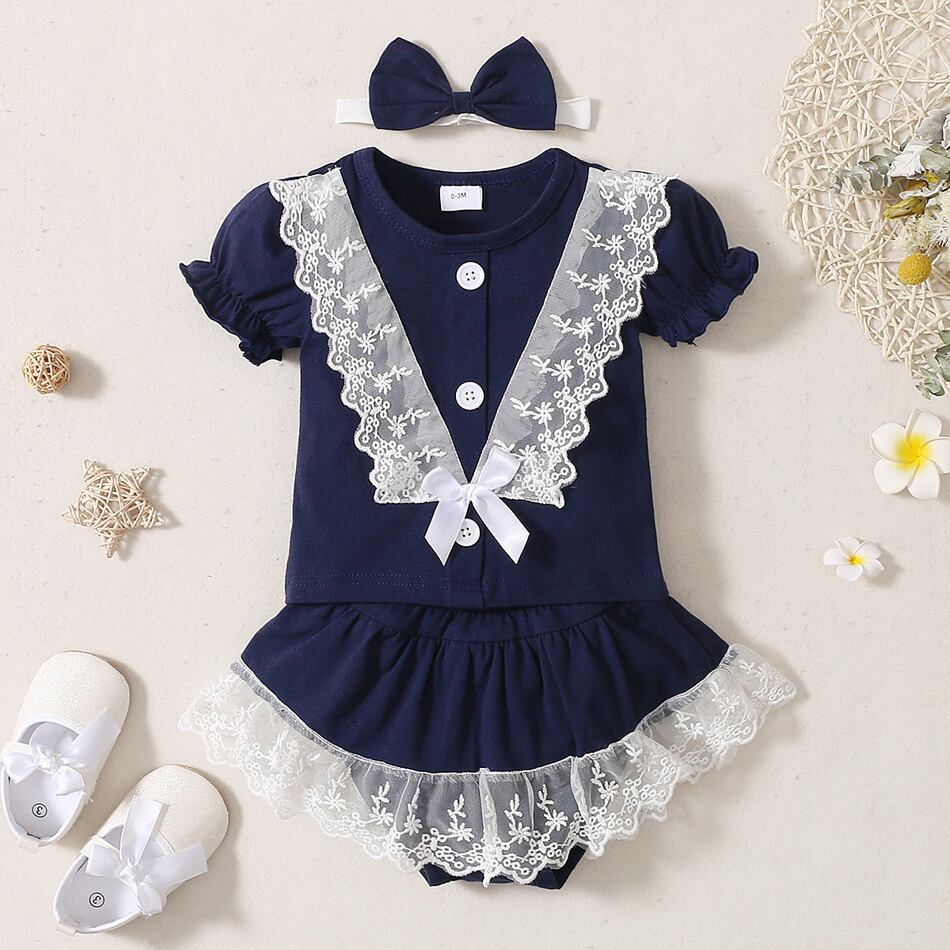 新作 女の赤ちゃんサマーローマーセット幼児よちよち歩き Outft レースシャツパフスリーブ + レースロンパーススカート + ちょう結びカチューシャ 3 個セット 0-18M