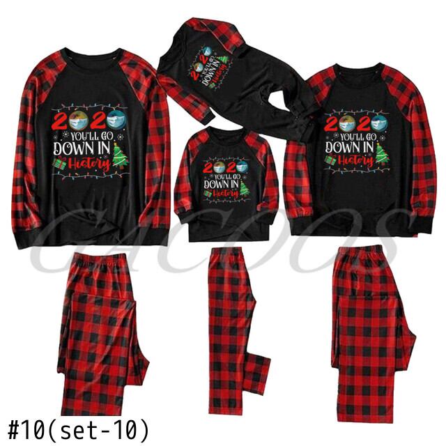 新作 家族クリスマスパジャマ 2021 母父子供ホームウェアスーツ漫画トップス + チェック柄パンツ子供服セットベビーロンパースパジャマ