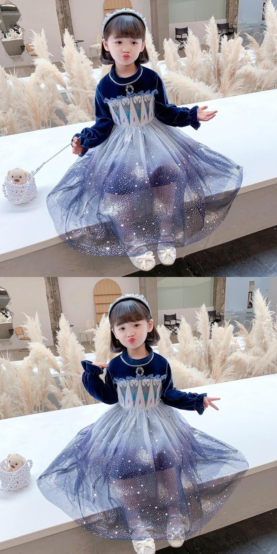 新作 冬秋暖かいドレス女の子長袖毛皮エルザコスプレ夜会服キッズパーティー冷凍