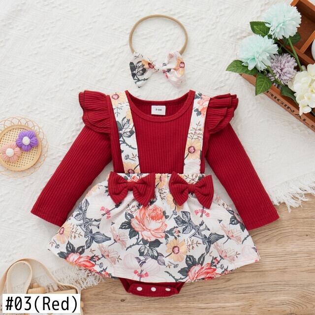新作 PatPat 2ピース ベビーガール 綿95% リブ 長袖 フェイクツー 花柄 ロンパース ヘッドバンドセット付き