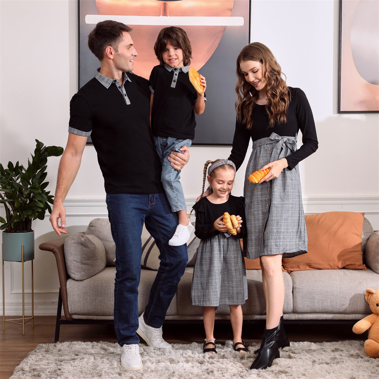 新作 PatPat Plaid Splicing Black 長袖ファミリーマッチングセット(ドレスと半袖ポロシャツ)