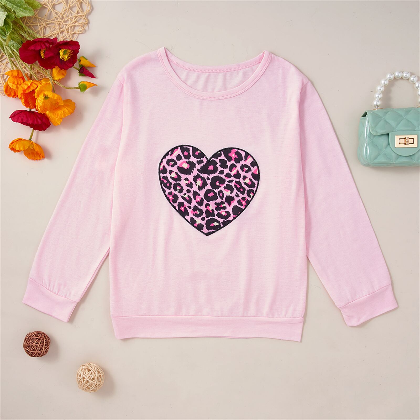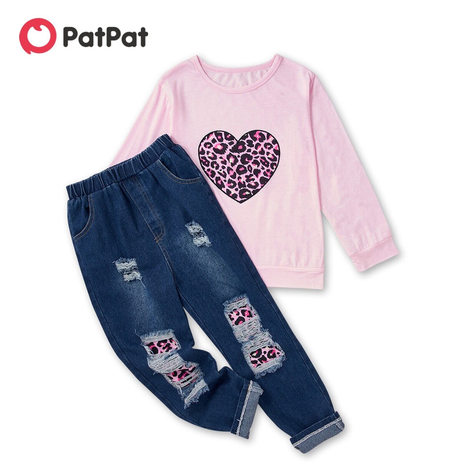 新作 PatPat 2 ピース キッド ガール ヒョウ ハート プリント ブラック プルオーバー スウェットシャツとパッチワーク リップド ジーンズ デニム パンツ セット