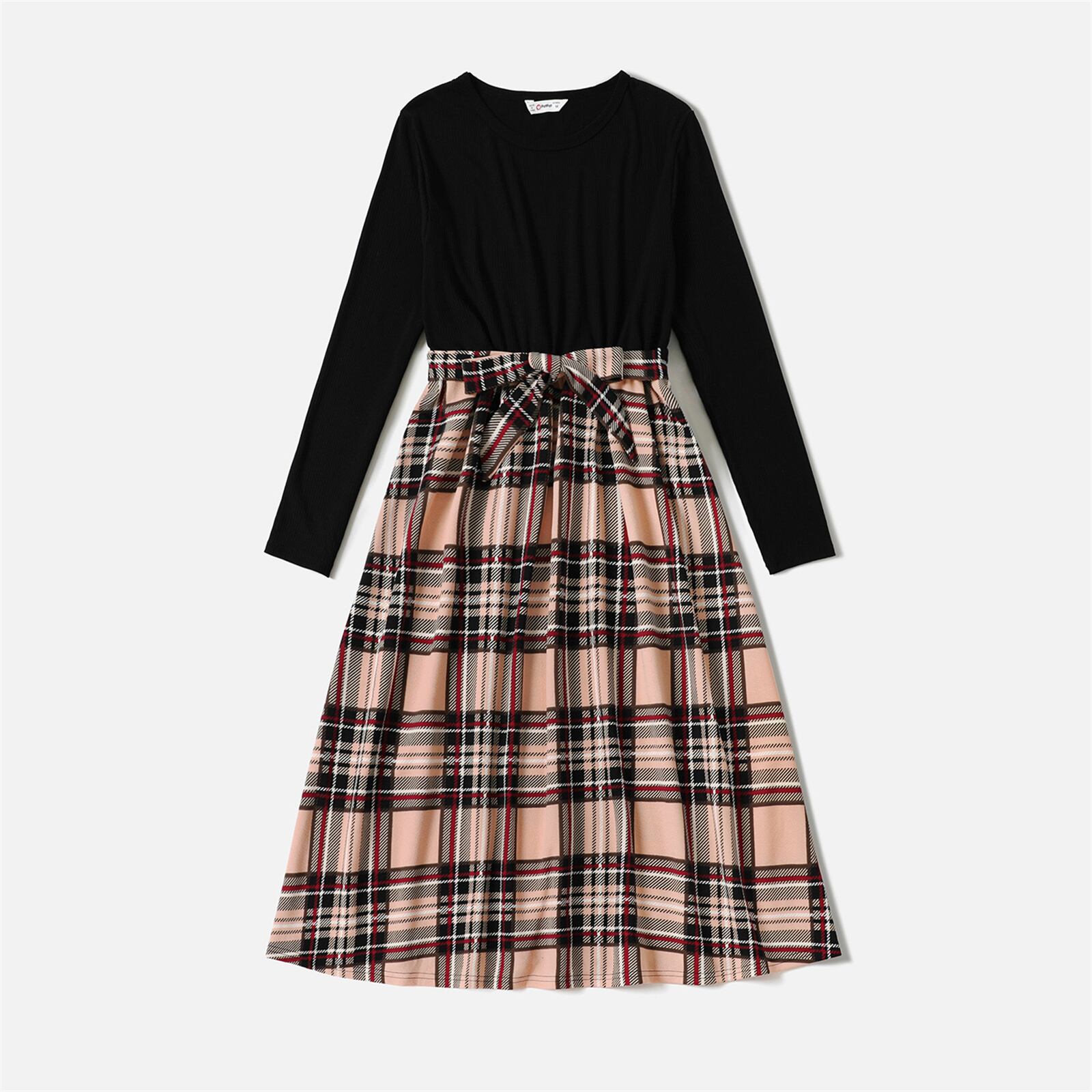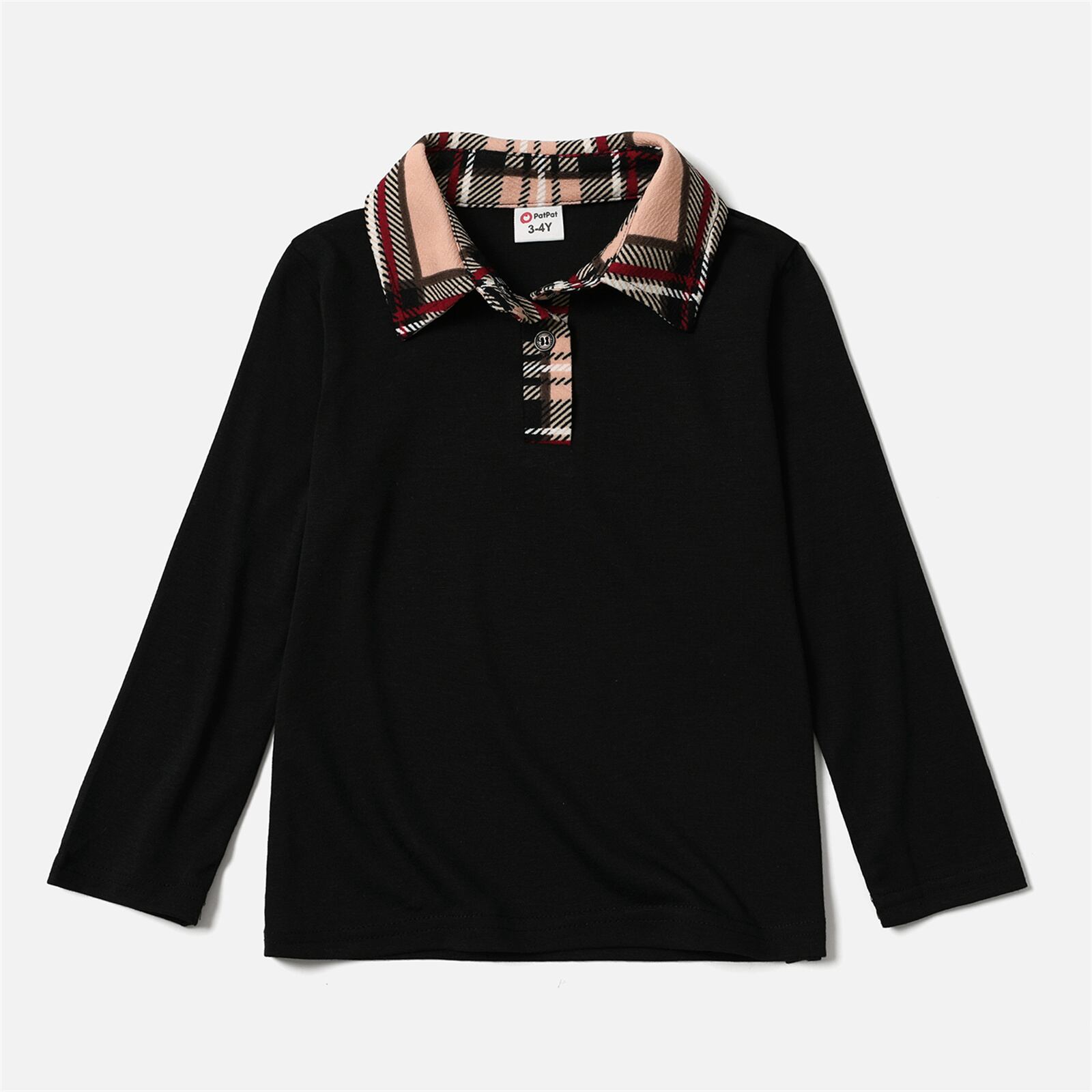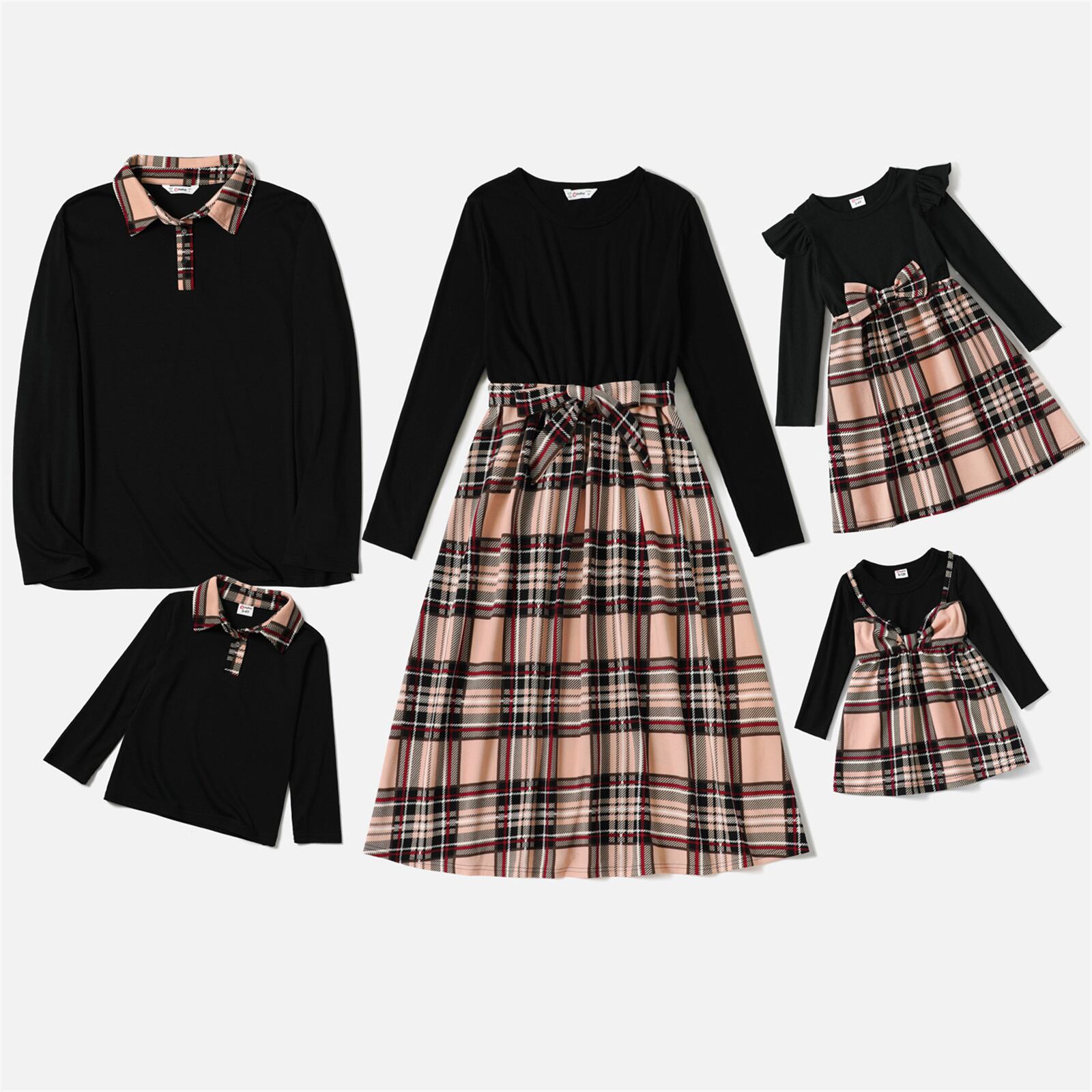 新作 PatPat ファミリー マッチング ブラック 長袖 スプライシング チェック柄ドレスとポロシャツ セット