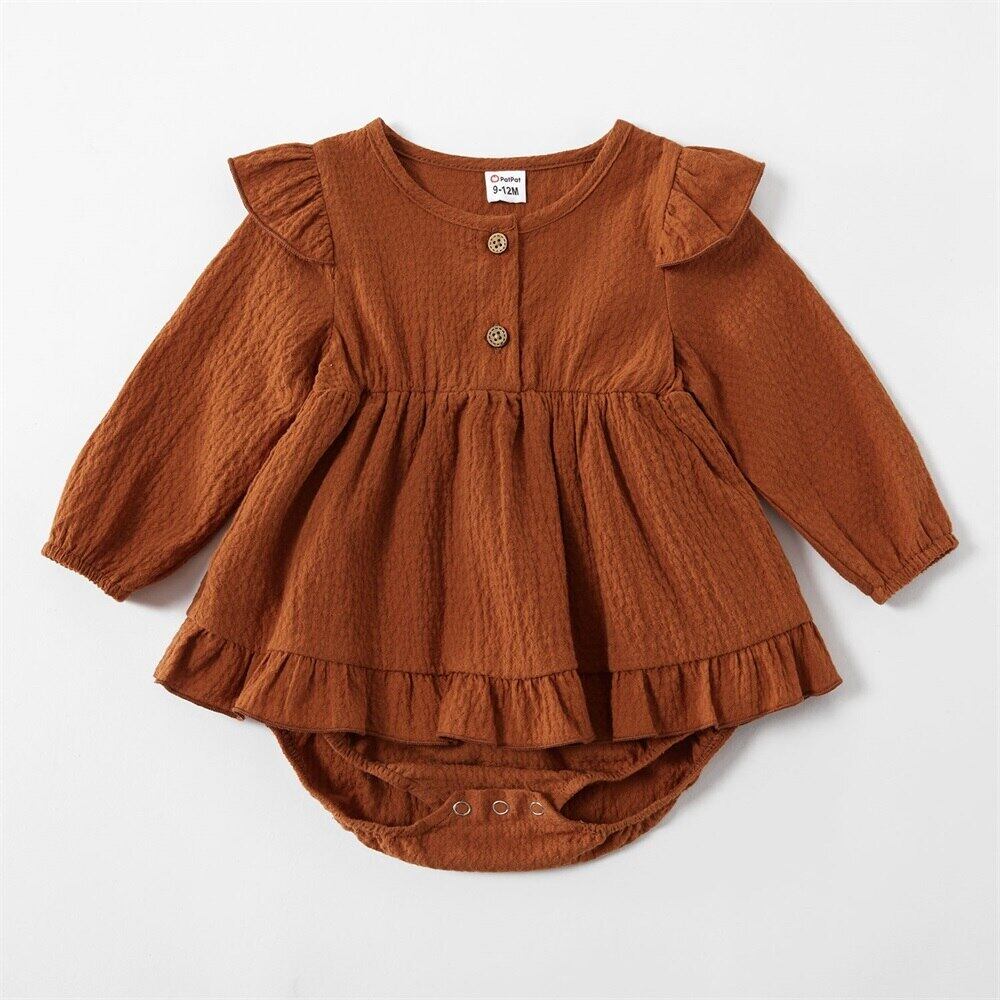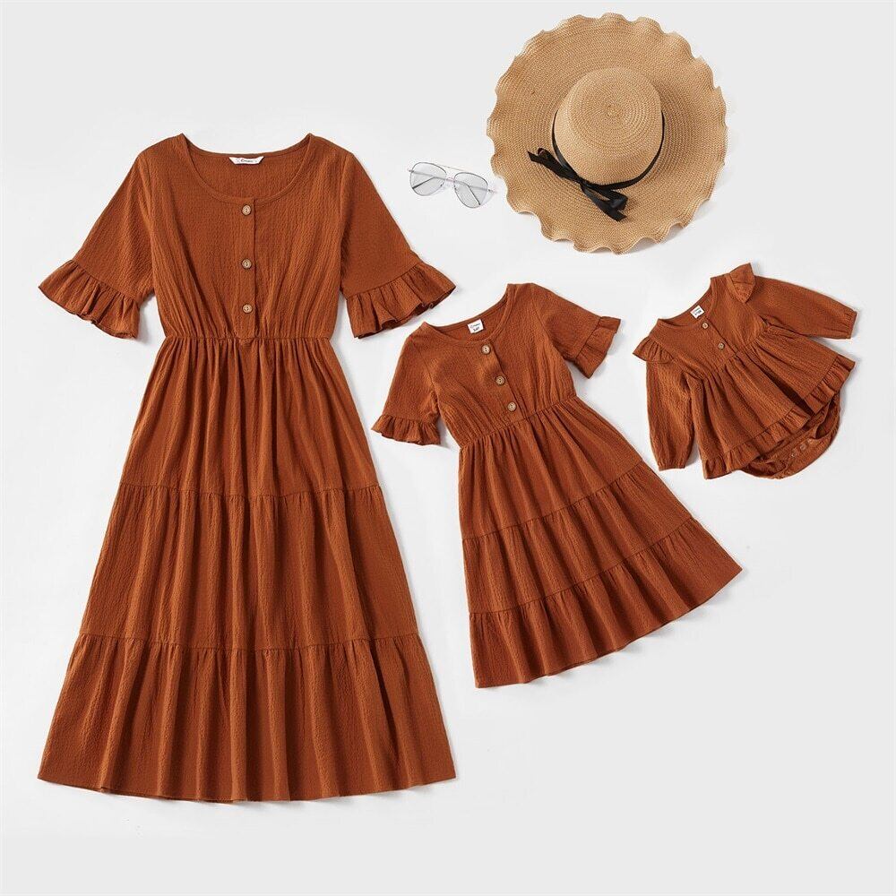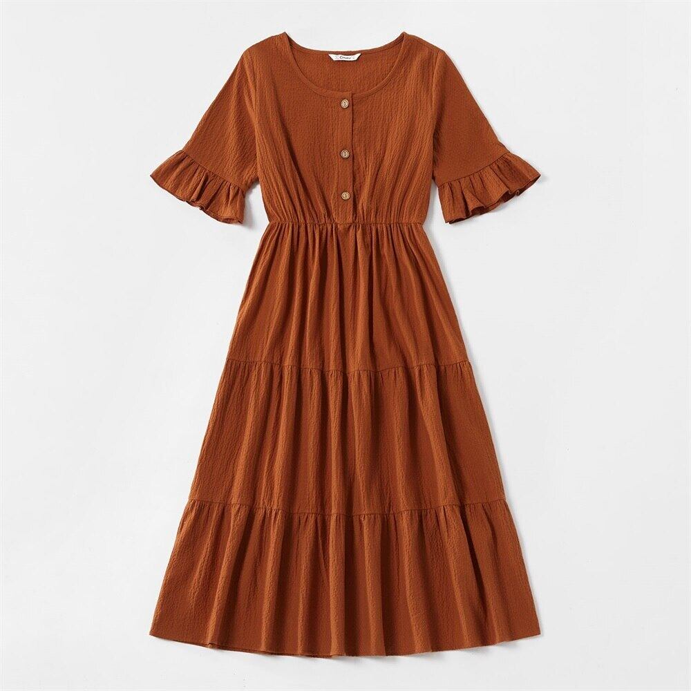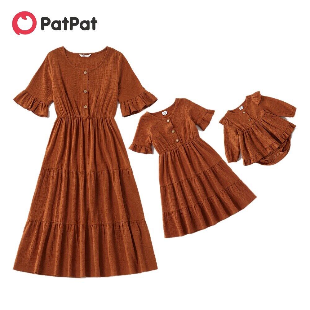 新作 PatPat 100% コットン ソリッド カラー フリル カフ マッチング ブラウン ミディ ドレス レッド カジュアル マッチング ドレス