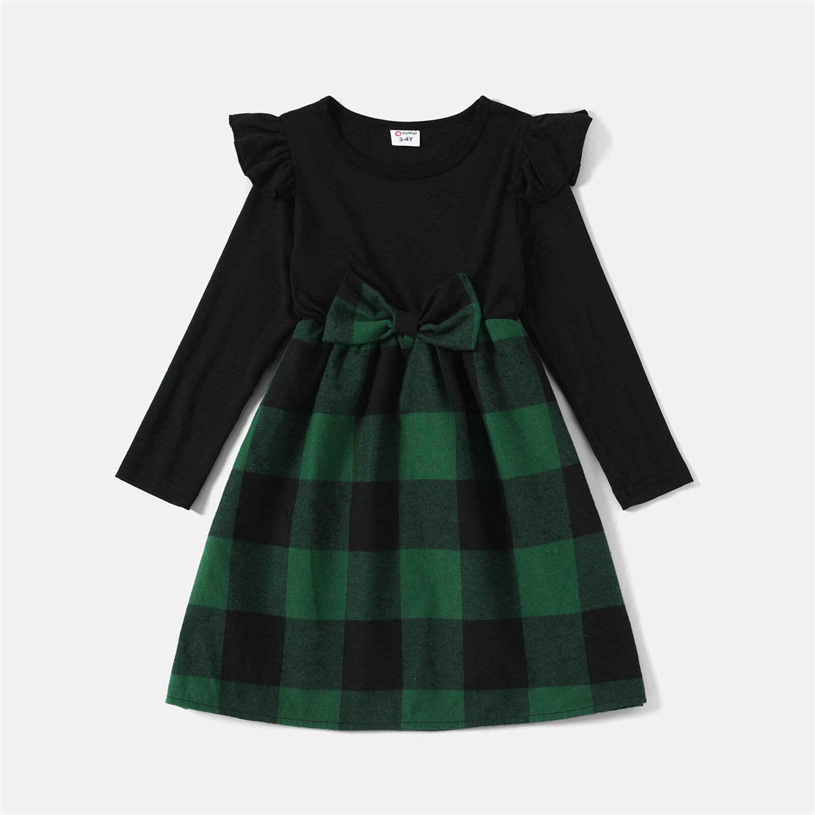 新作 PatPat ファミリーマッチングチェック柄長袖スプライシングベルト付きミディドレスとシャツセット