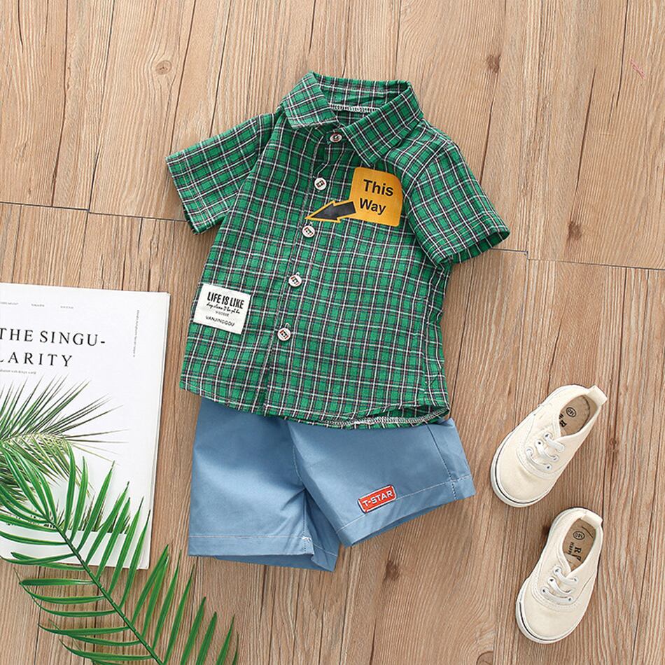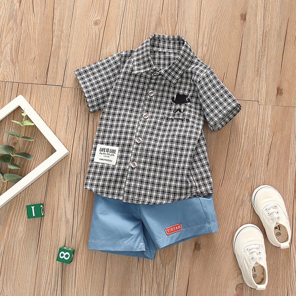 新作 夏セット男の赤ちゃん服幼児格子縞のシャツ + パンツ衣装子供着用子綿トラックスーツ 18M-5Y